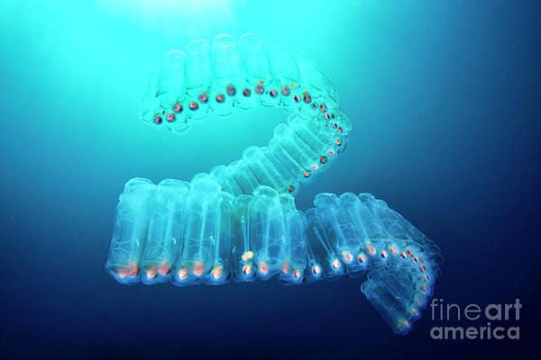 Это хордовые животные, похожие на прозрачного кальмара (хотя ему не родичи), которые объединяются вот в такие ленточные колонии и жрут планктон. Между прочим, ключевой игрок на поле уменьшения количества углеводорода в атмосфере. У этой фигни есть мозги! Правда, только в детстве, когда они похожи на головастиков. А ещё внутри куполов сальп могут прятаться маленькие рыбки.