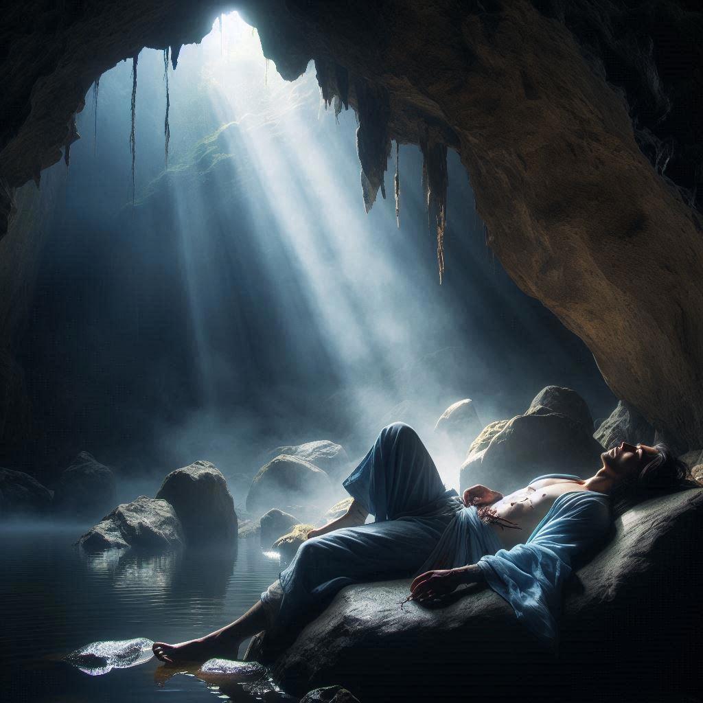 Под сводами пещеры было не так уж темно — трещины в породе позволяли закатному солнцу свободно заглядывать внутрь. Стоило отойти от входа, кажущегося снаружи чёрным, как открывался чудесный вид на внутреннее озерцо.