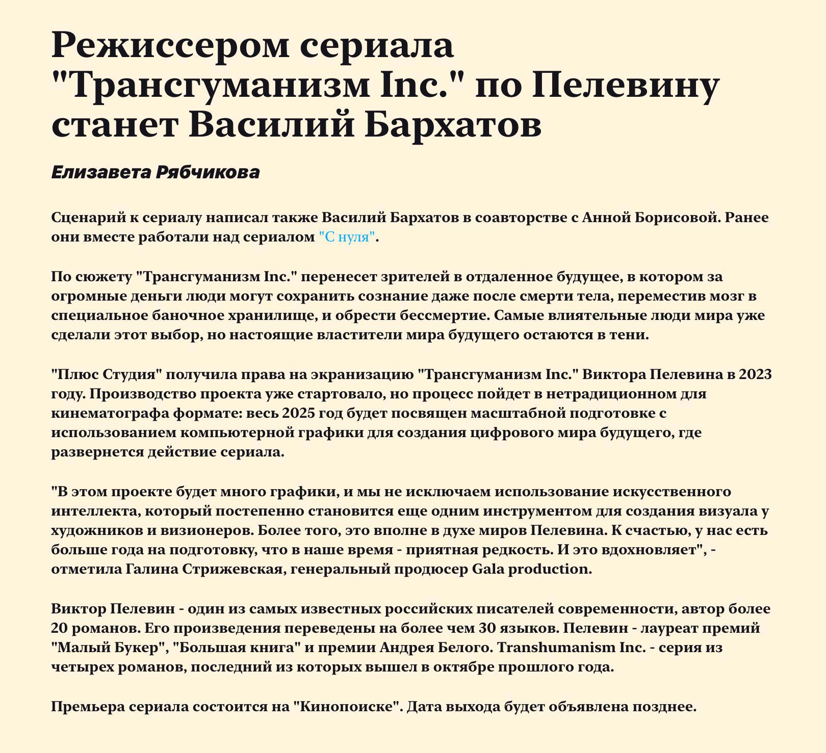 Как сообщает пресс-служба «К..», «П…» приобрела опцион на экранизацию книги Transhumanism Inc. в 2023 году. Производство сериала уже началось. Представители платформы уточнили, что весь 2025 год будет посвящен масштабной подготовке с использованием компьютерной графики для создания цифрового мира будущего, где происходит действие сериала. Партнером «П…» по производству сериала выступает компания G….