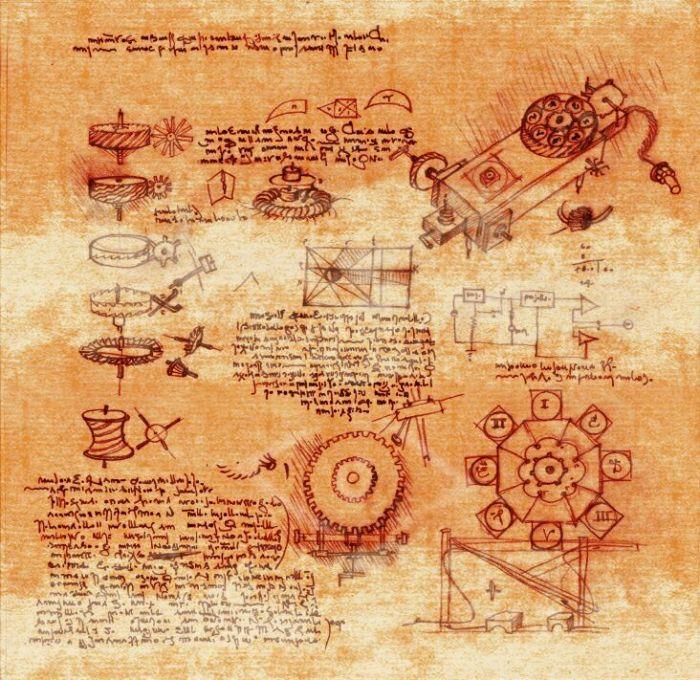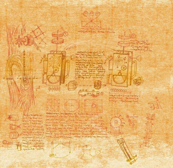 Многие его рисунки и документация к ним написаны на разных языках, от итальянского и его диалектов, до так и не расшифрованной смеси символов, напоминающей раннемасонские математические шифры.