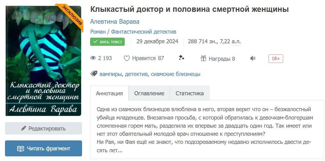 Читать детективный роман "Клыкастый доктор и половина смертной женщины" тут. (ссылка)