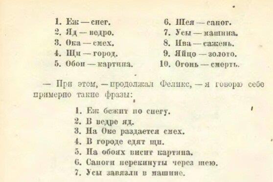 По сюжету рассказа, автор, будучи ребенком, попал на представление, где мальчик запоминал и безошибочно называл любые из 100 слов, записанных зрителями в зале. И по воле случая познакомился с этим юным гением, который поведал ему этот секрет (в обмен на коллекцию марок). Приведу несколько страниц из этой книги с описанием метода запоминания.
