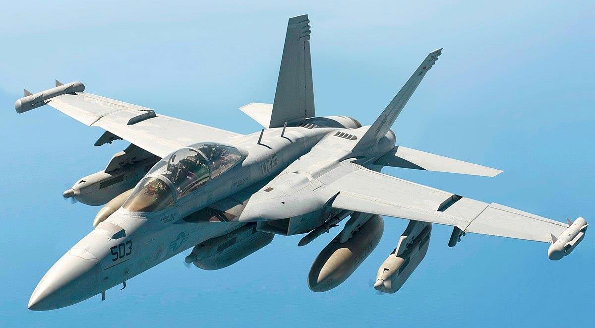 Поводом для меня стала авария одного самолёта палубной авиации сэшэании. Это самолёт радиоэлектронной борьбы EA-18G «Growler» (Кровлер). Внешне его трудно отличить от основы, из которой он был сделан – это основной «палубник» сэшэании F/A-18F «Super Hornet». Посмотрите сами. Вот это сам «Супер хорнет»: