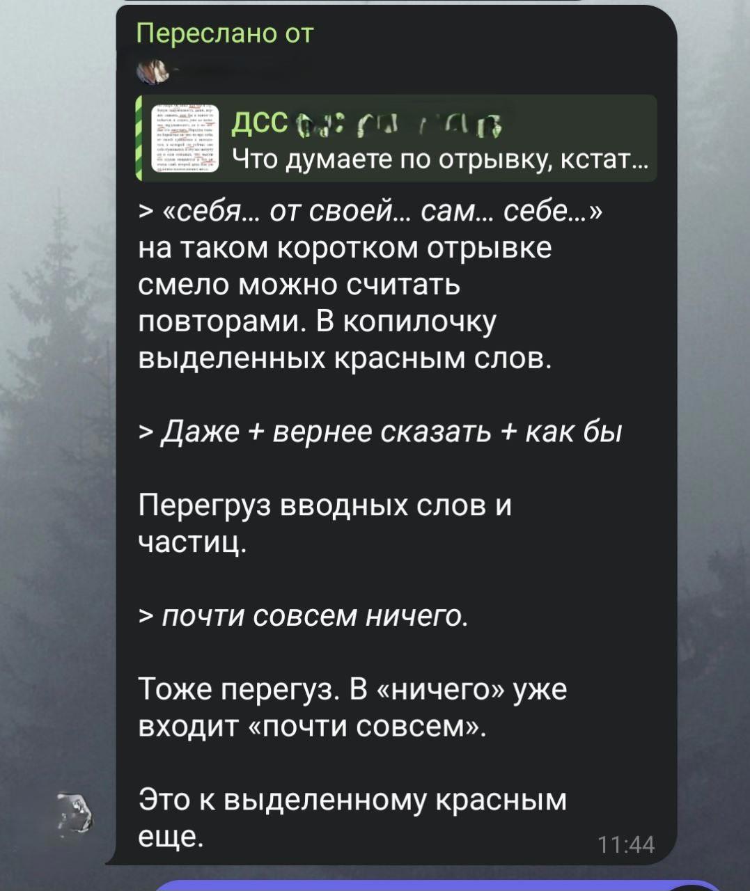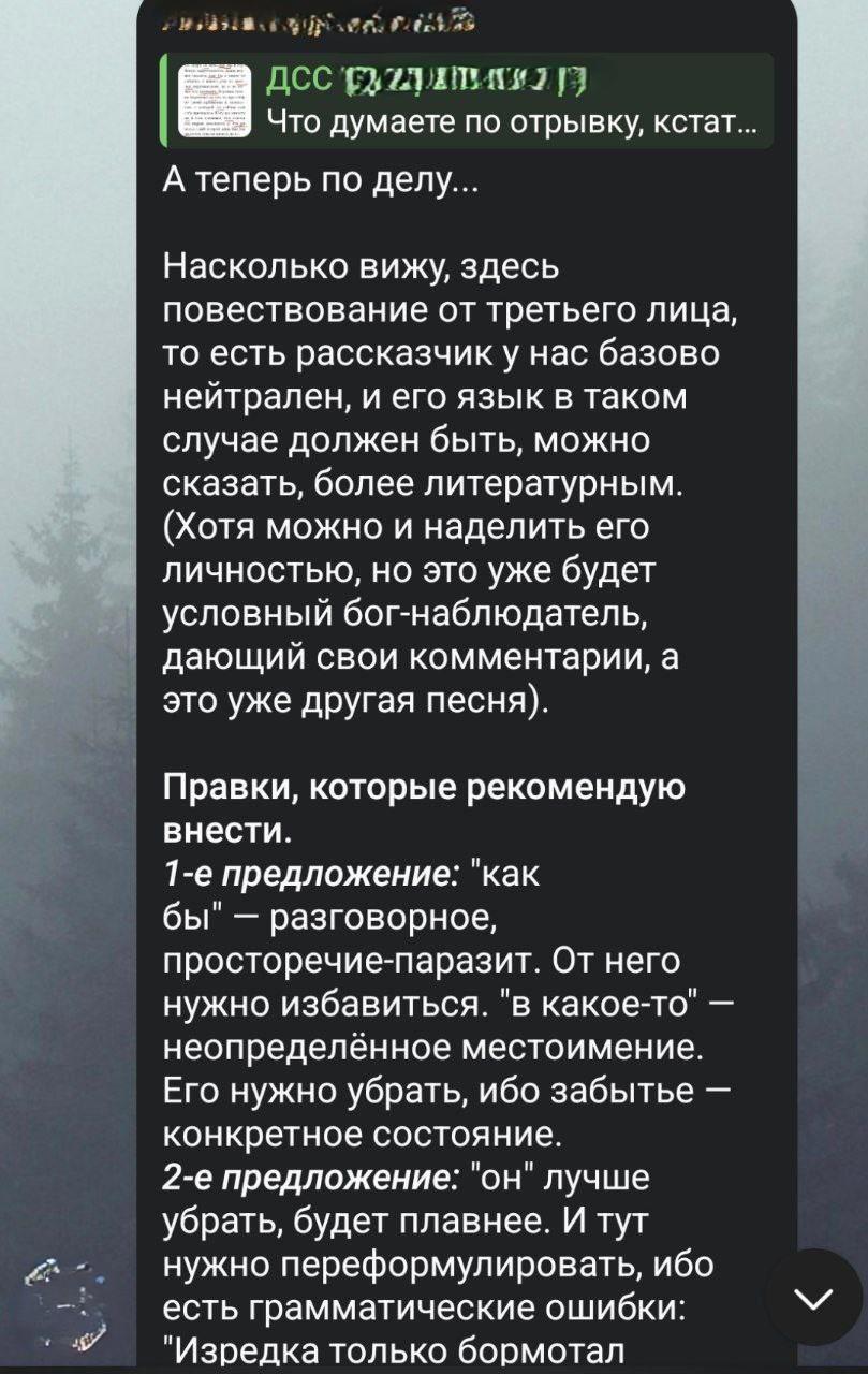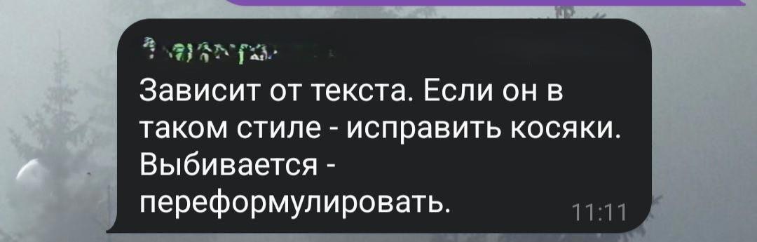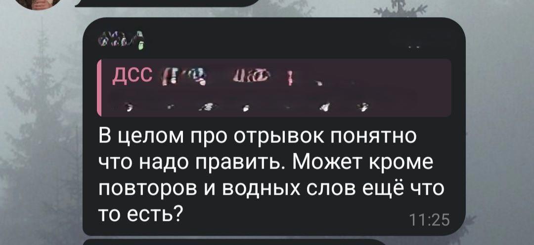 Коллеги единогласно пришли к выводу, что текст нужно править. А дальше я просто покажу скриншоты (естественно, все имена и аватарки замазаны; название чата тоже разглашать не буду, потому что цель — не разоблачение, и вообще все события выдуманы, а совпадения случайны).