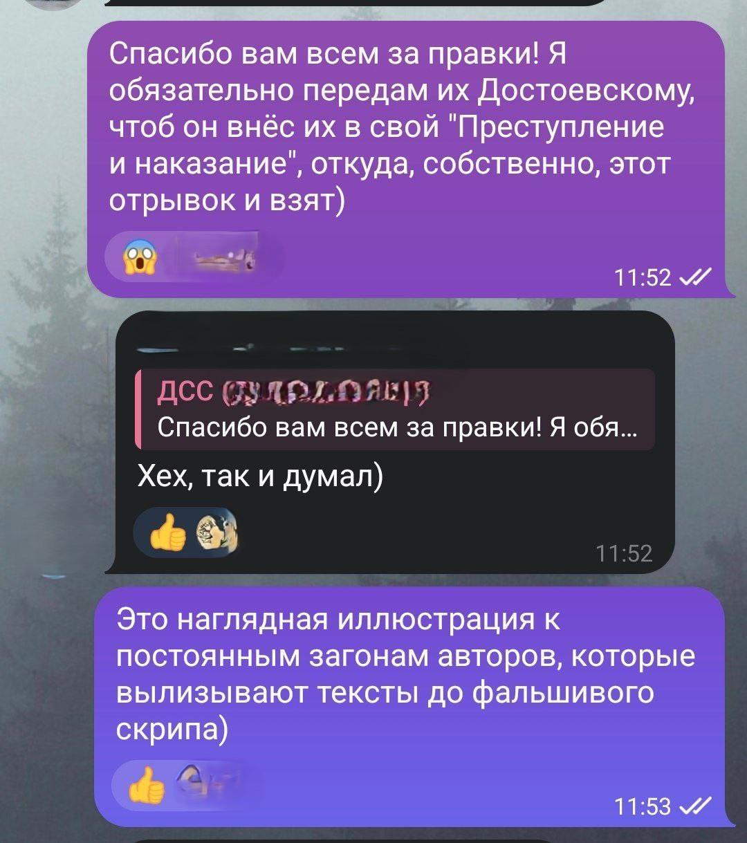 В чём суть? Я скинул в беседу отрывок из «Преступления и наказания» (первый скриншот) и спросил, что не так с текстом. Тут-то и началось веселье.