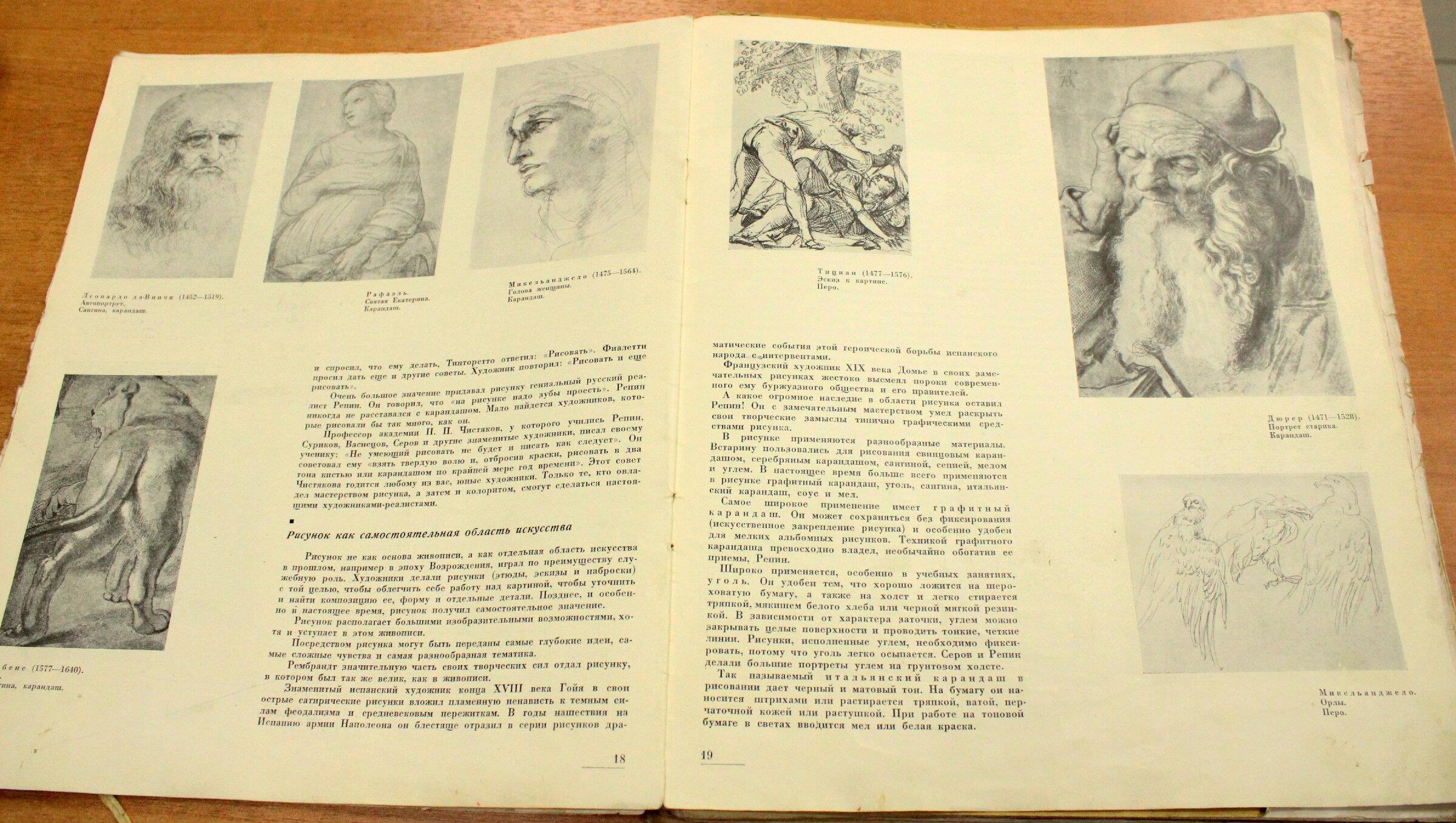 И надо сказать, что временами в журнале приводился более широкий подбор работ, чем это принято в наше время. Вот, к примеру, статья по технике рисунка, проиллюстрированная работами старых мастеров. Конечно, без автопортрета Леонардо, св. Екатерины Рафаэля или головы старика Дюрера не обходится практически ни одно руководство по рисунку. А вот лев Рубенса, эскиз драки Тициана и орлы Микеланджело встречаются гораздо реже.