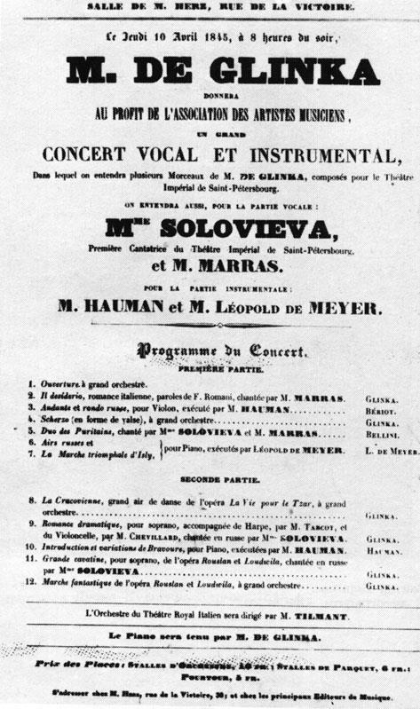 Музыку Глинки исполняли: симфонический оркестр парижского Théâtre-Italien под управлением известного дирижера Теофиля Александра Тильмана, и примадонна Петербургского Большого (Каменного) театра Екатерина Соловьева.