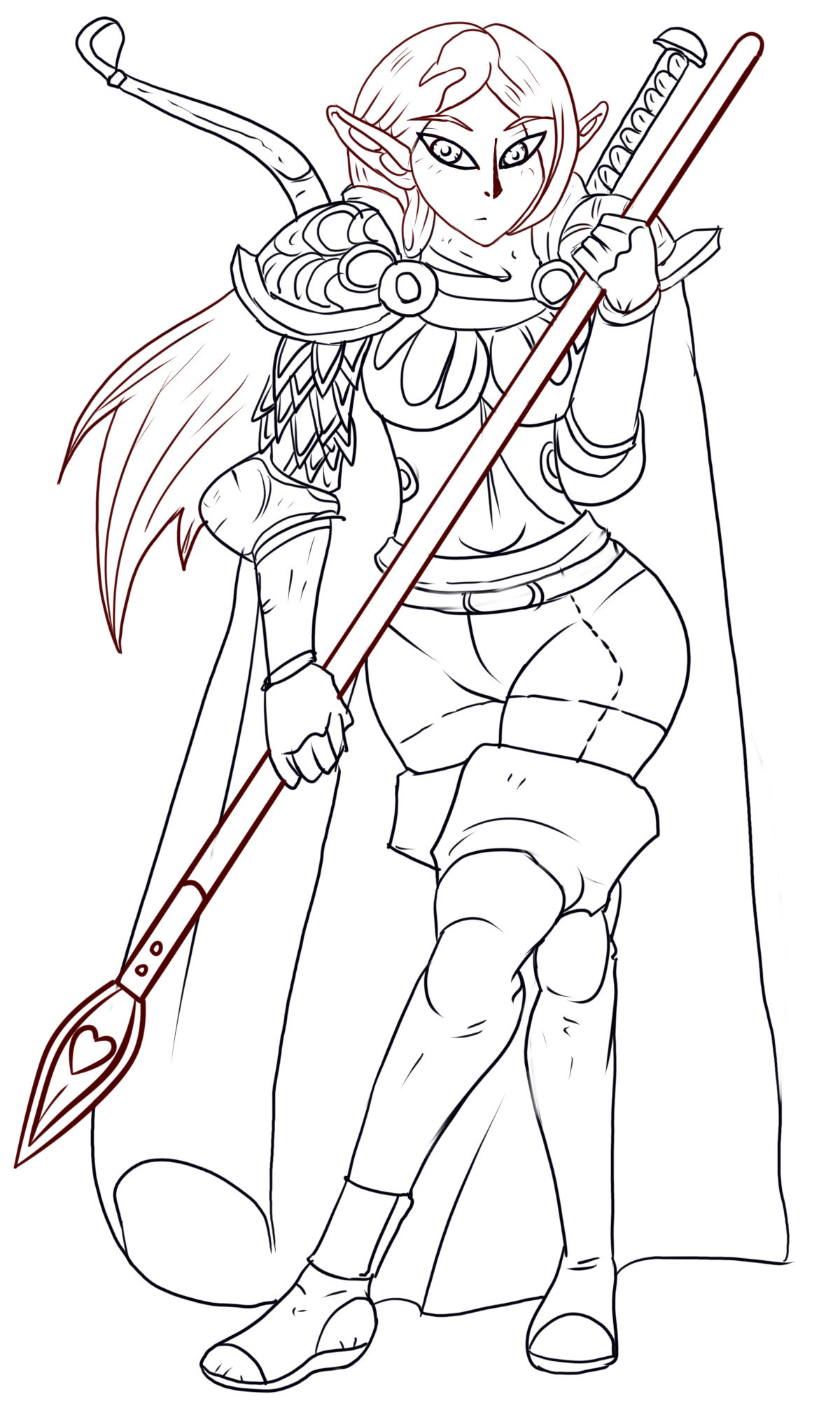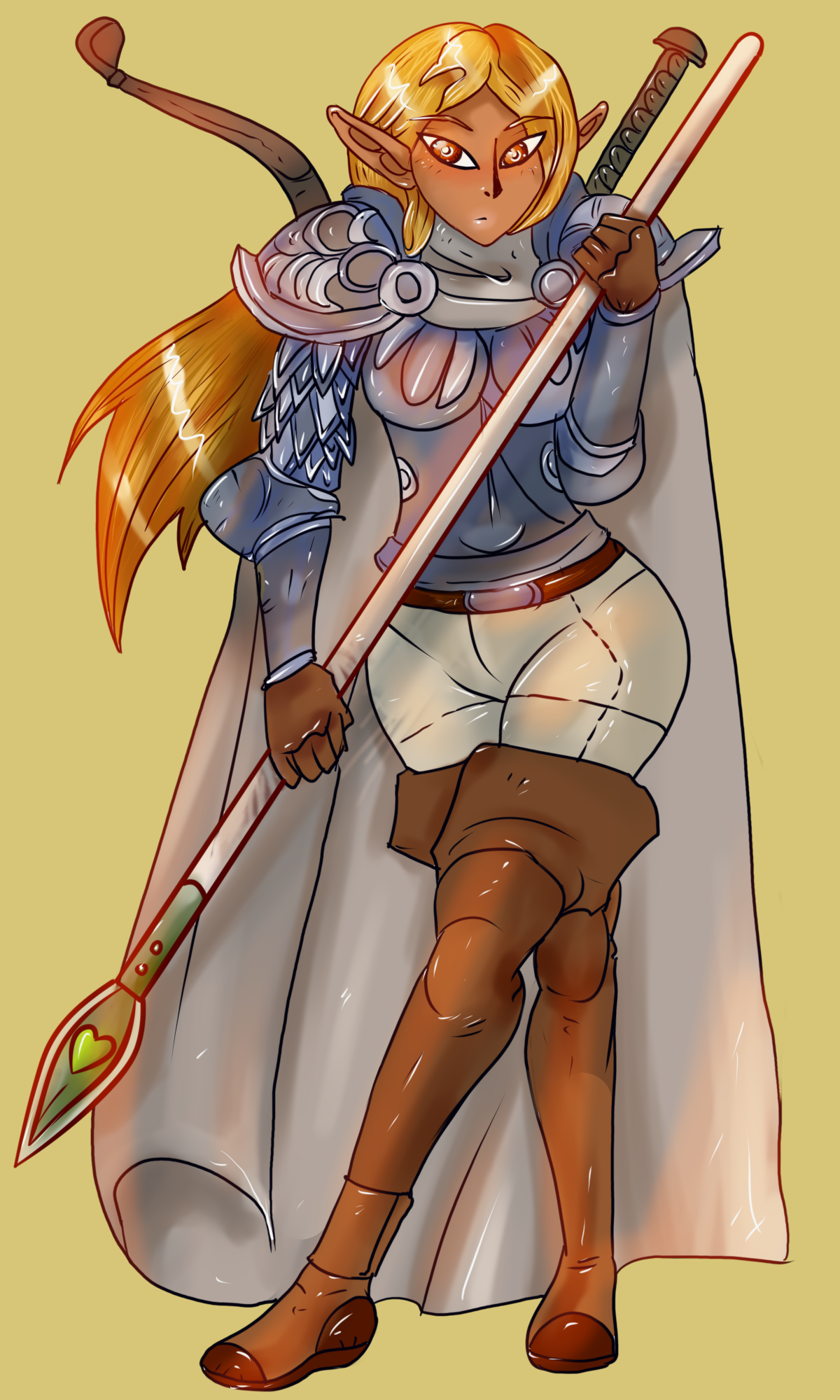 Потом покрас. В руках копье "Сердце Леса". Кожа смуглая, так как в Нелизе (стране где выросла Чибата) очень жарко. Наконец нарисовал "фейские" глаза. Такие у всех эльфов в этом мире.  Возможно еще порисую, но это очень утомительно