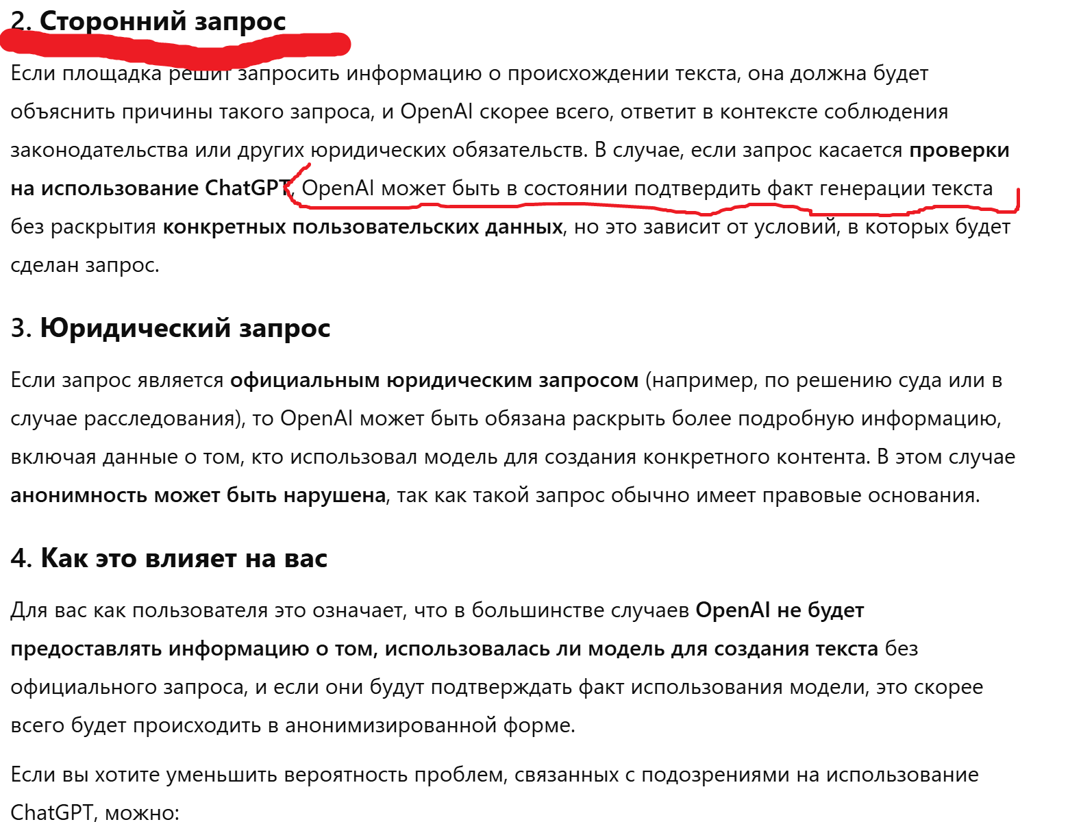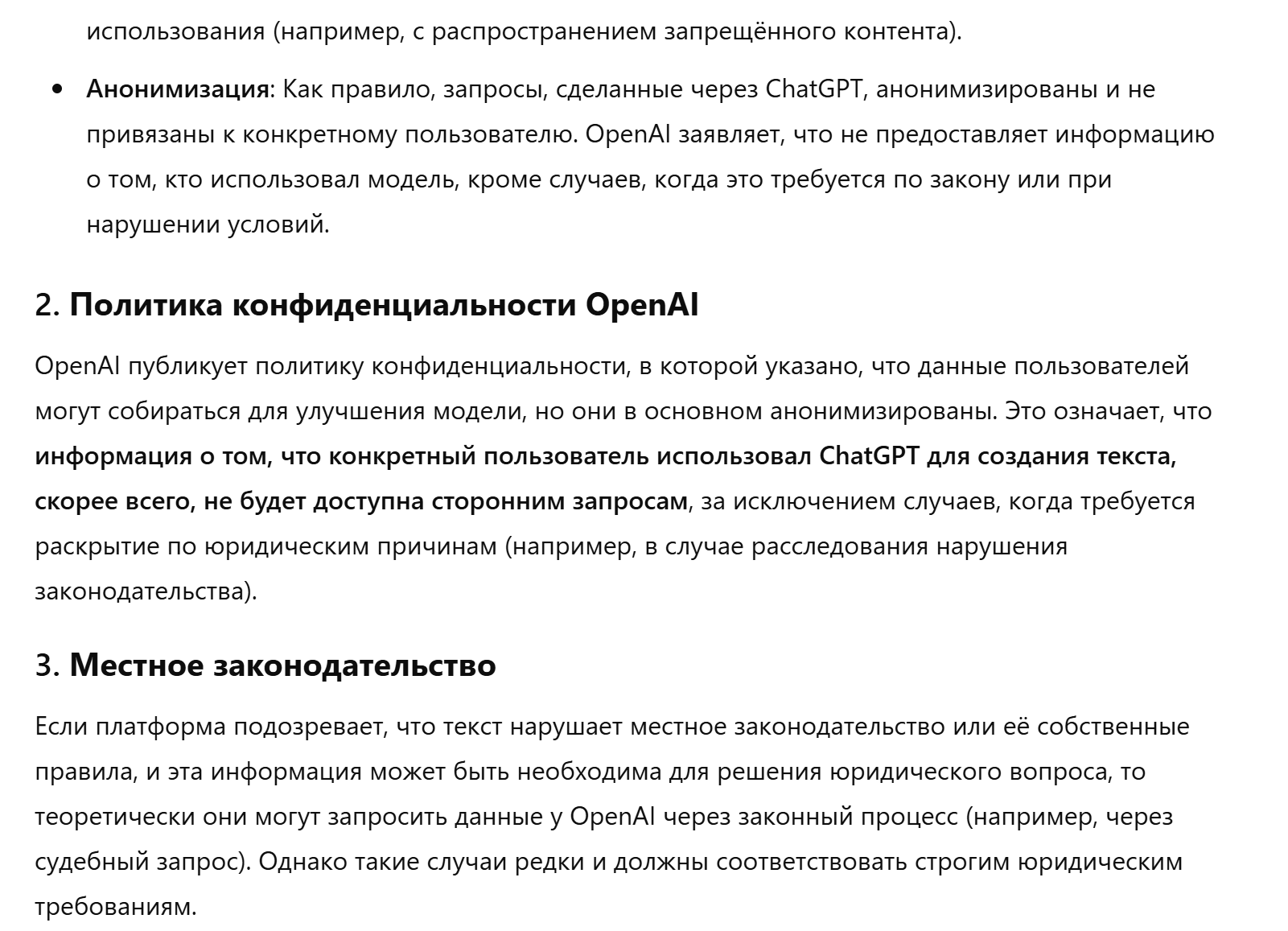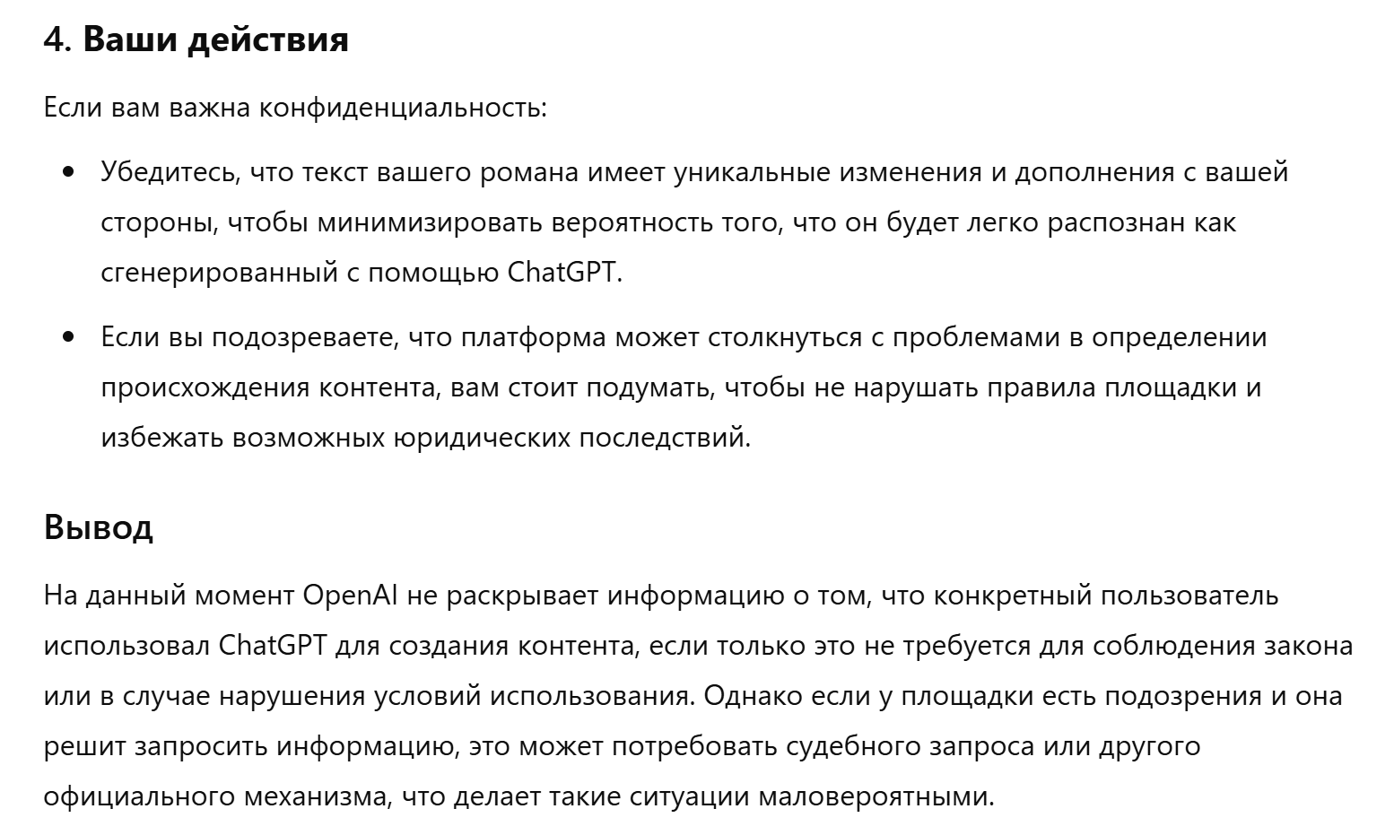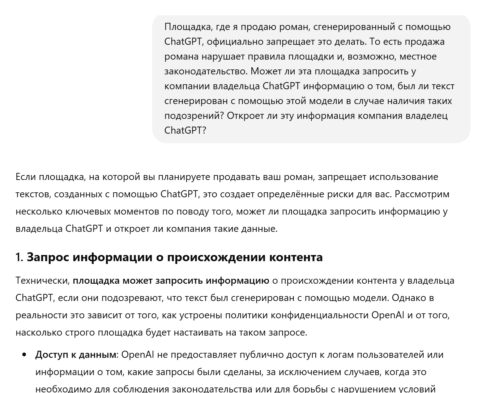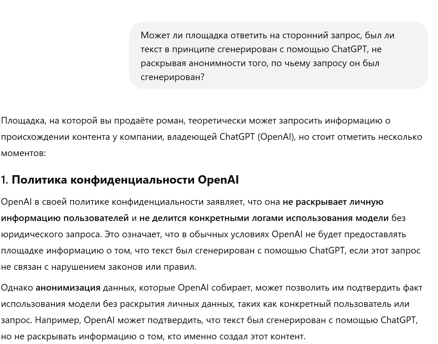 Ниже мой диалог с ChatGPT, объясняющий эту ситуацию подробнее. И да - комплаенс неизбежен. Это не вопрос "если", это вопрос "когда". По чисто экономическим причинам. Сами понимаете, после публичного разоблачения и бана профессия именно писателя будет закрыта. Вероятно, к тому времени можно будет пойти в "генераторы контента", но на другие деньги и условия. Как я думаю.