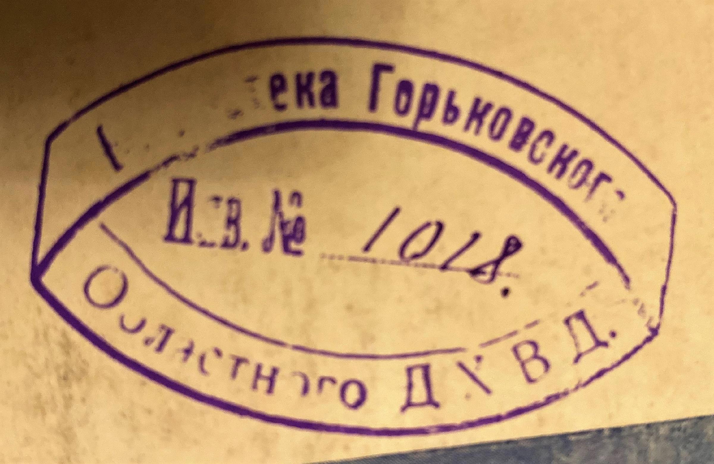 Открываю я журнал, восхищаясь его оформлением, и с удивлением вижу... библиотечный штамп! "Библиотека Горьковского Областного ДХВД" — объявляет он. Ниже можете разглядеть в подробностях.