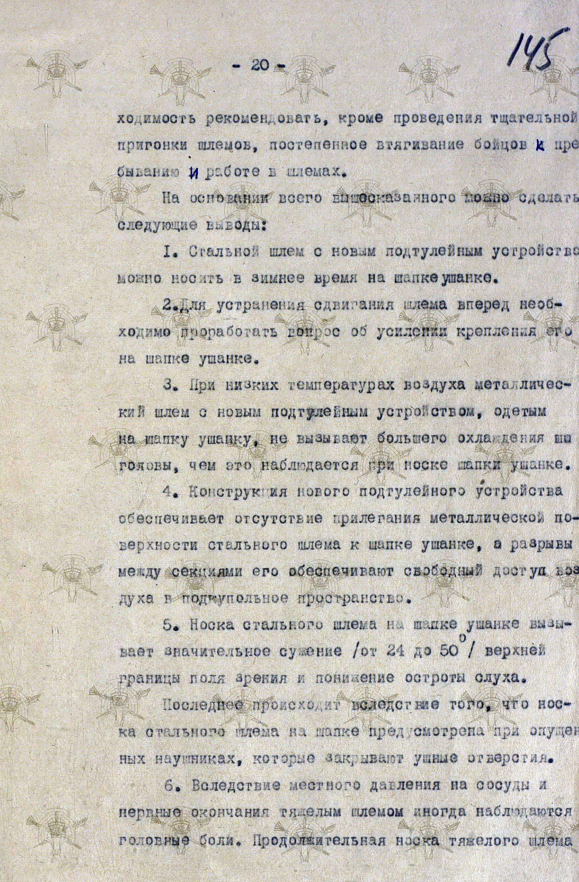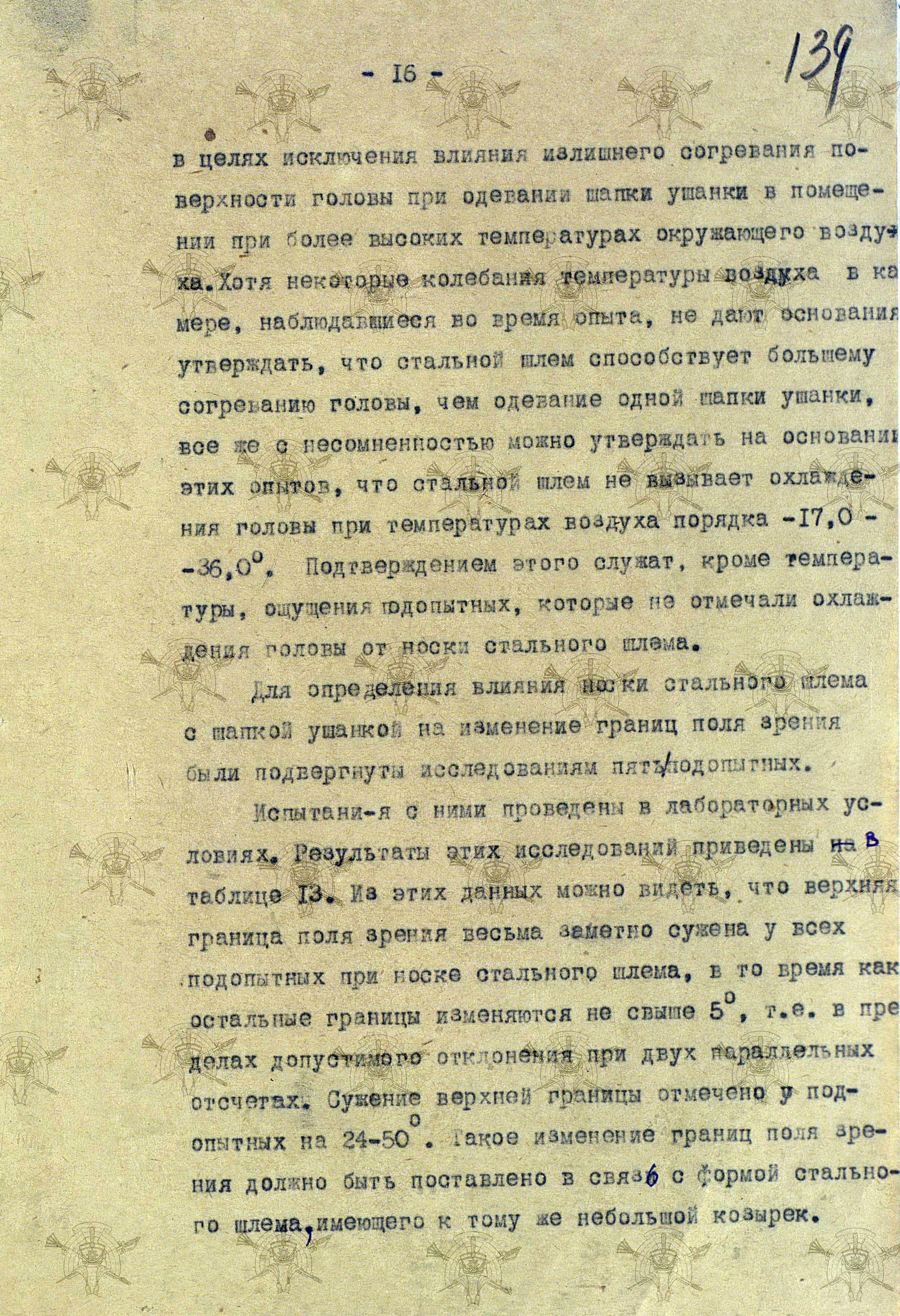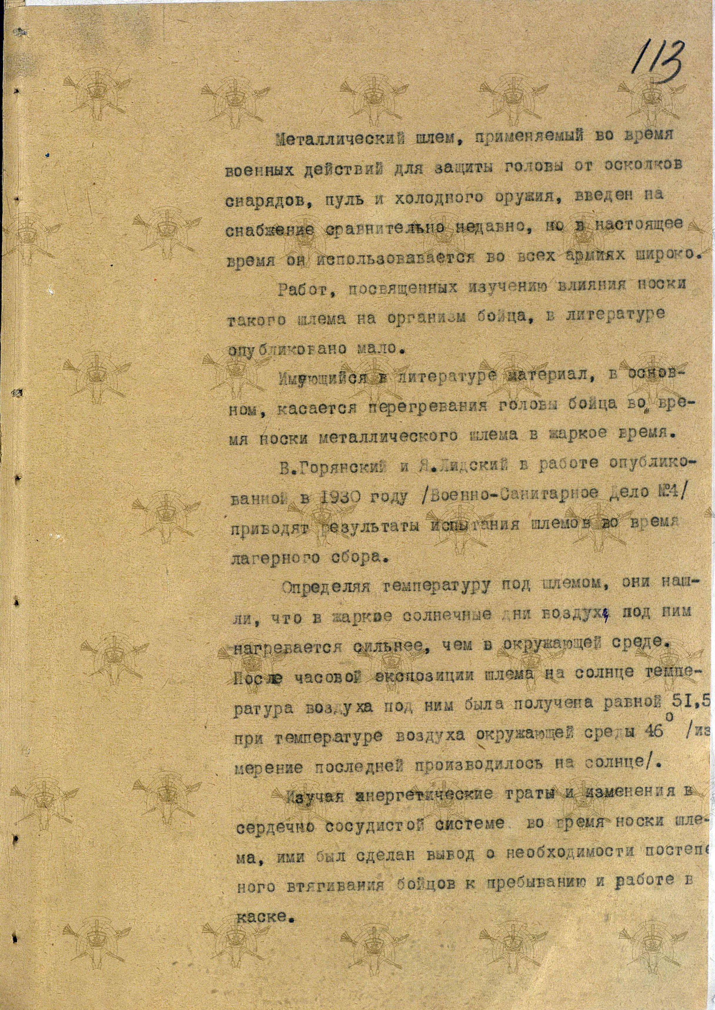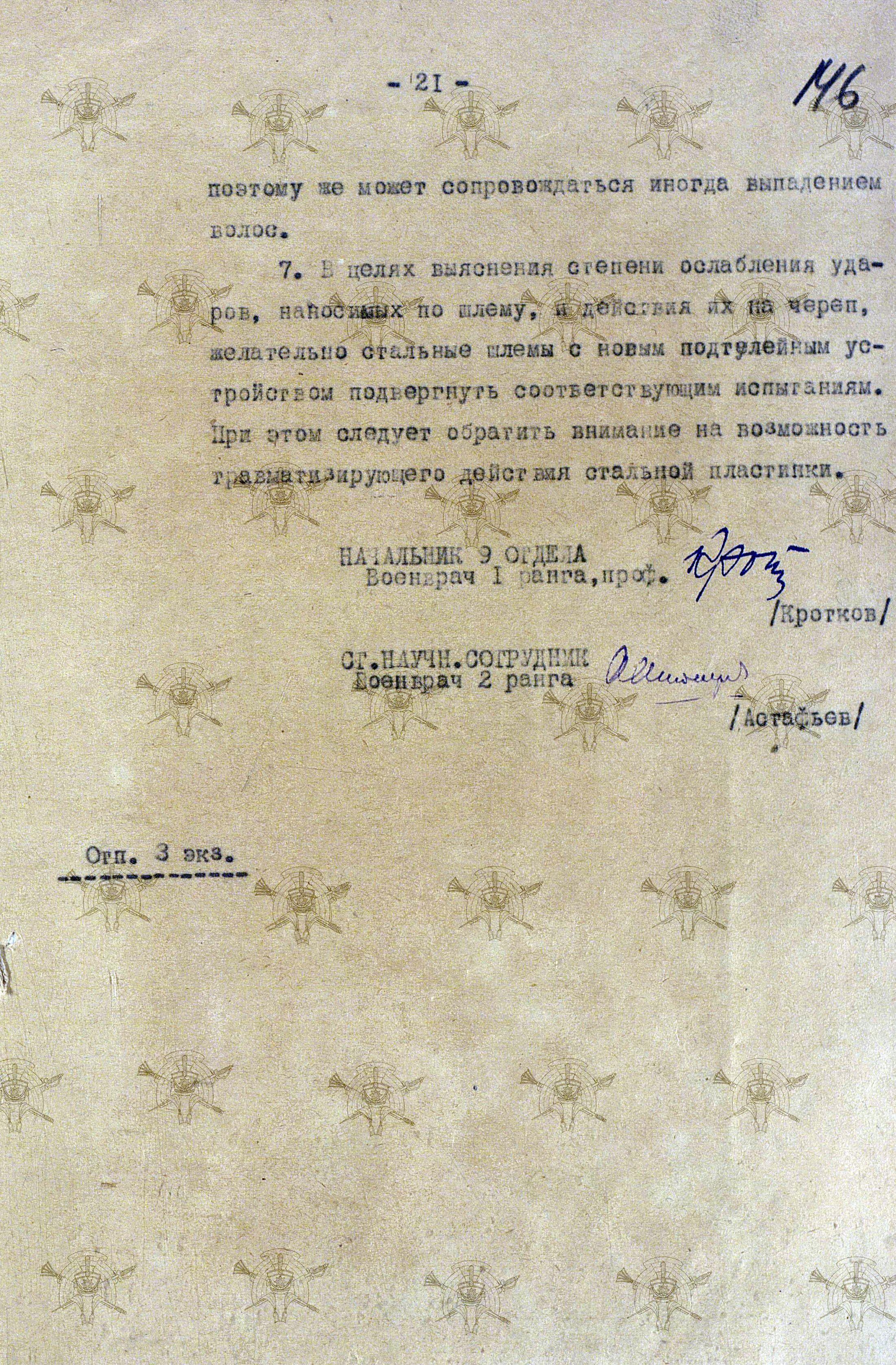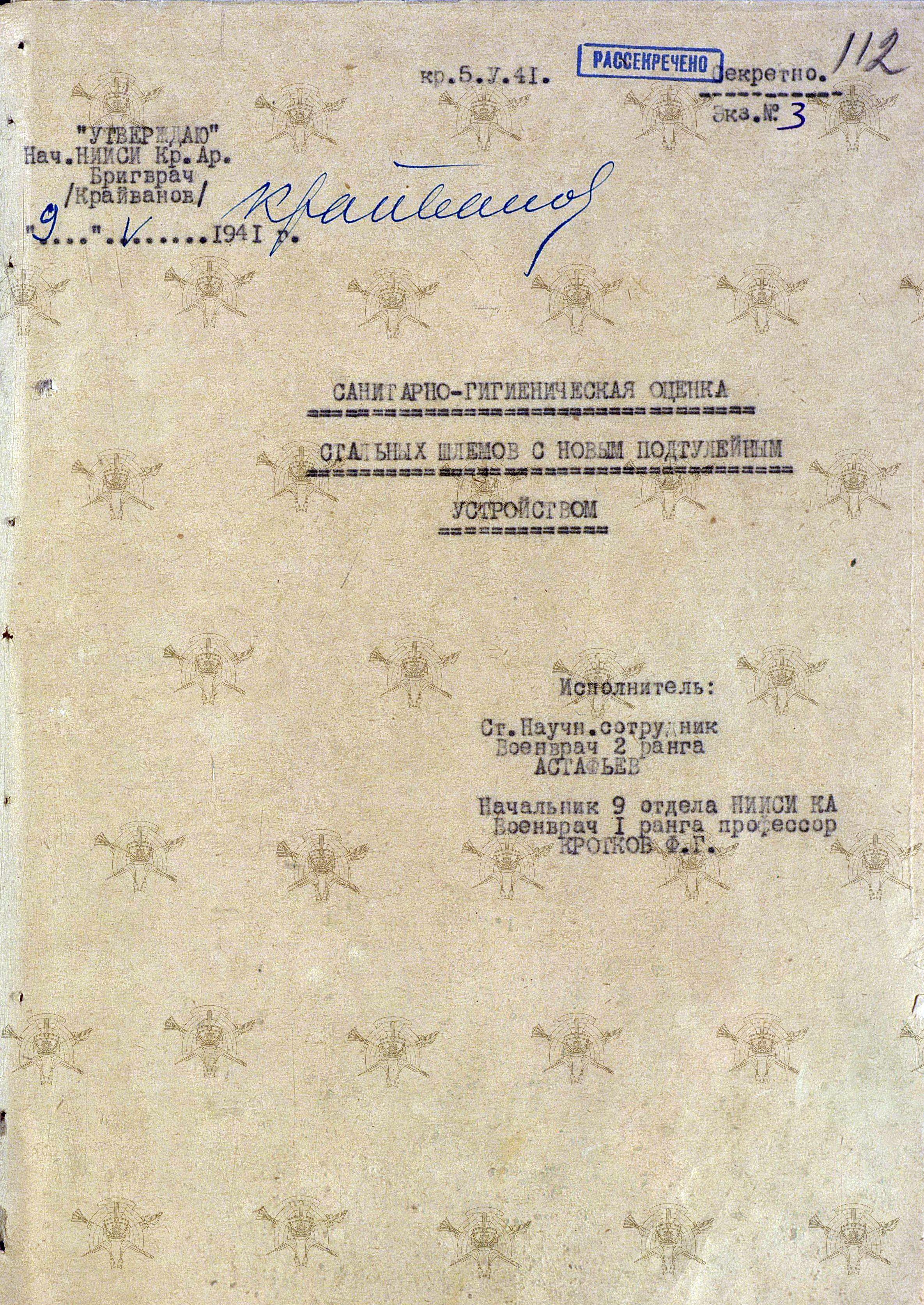 "Санитарно-гигиеническая оценка стальных шлемов с новым подтулейным устройством." 1941 г.