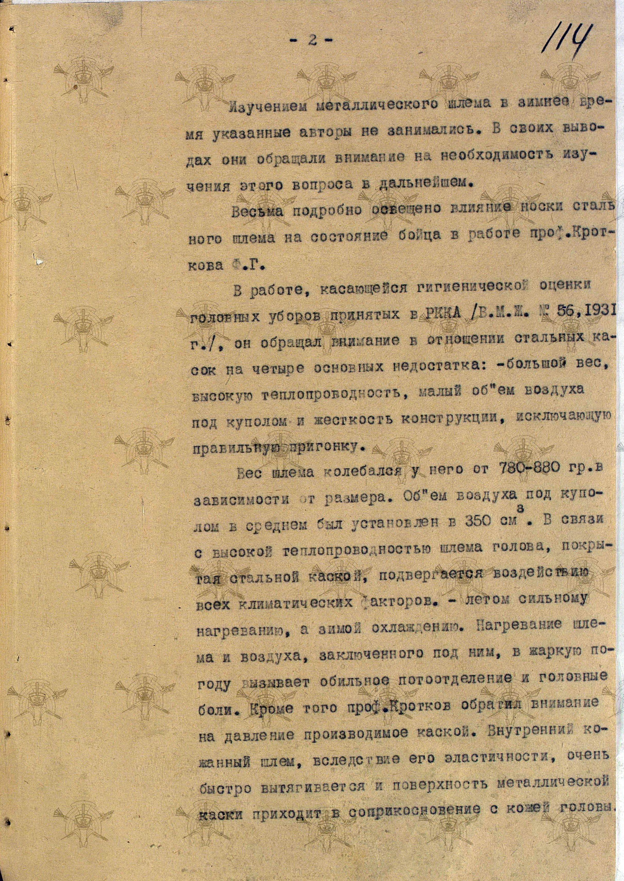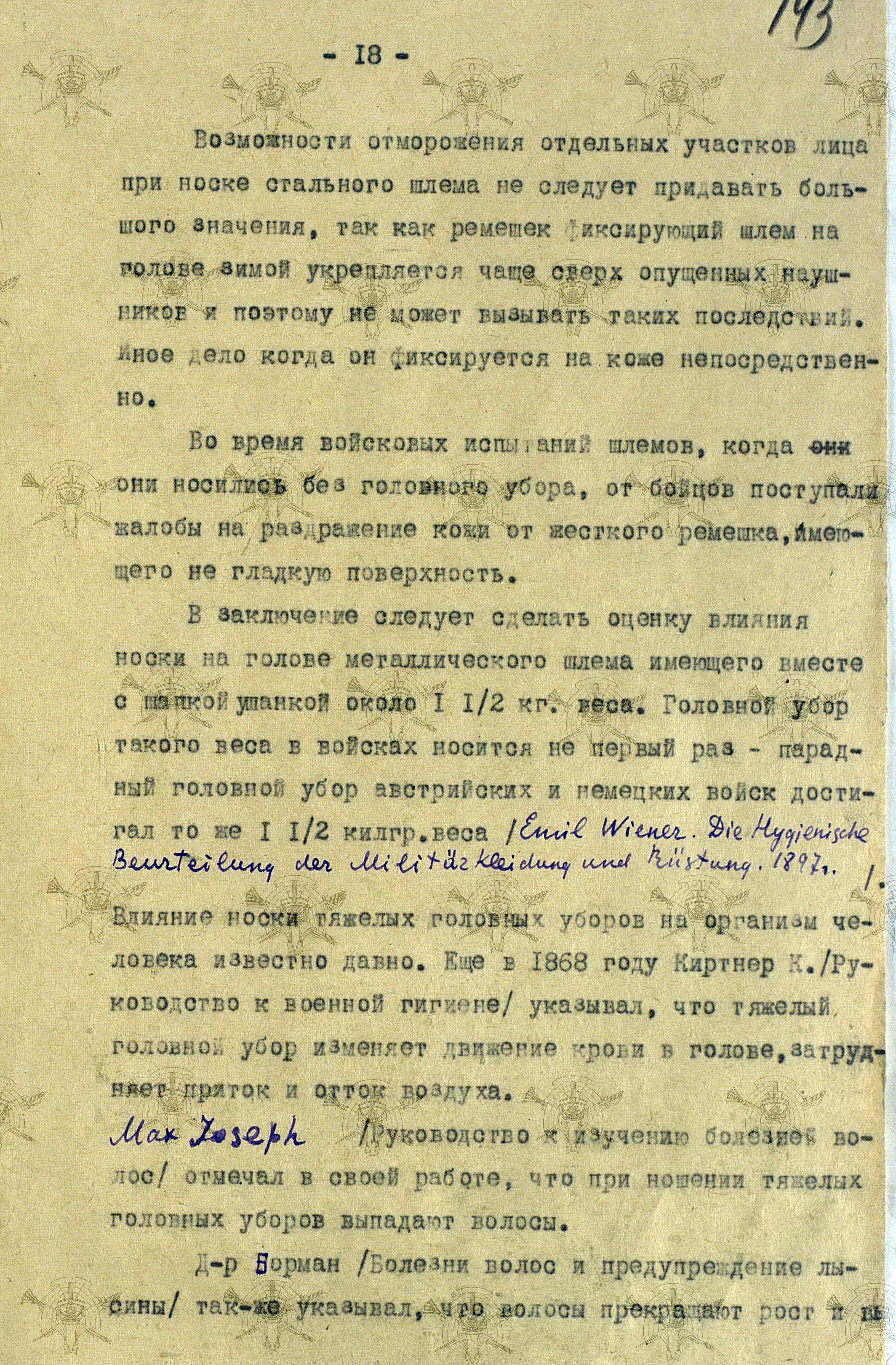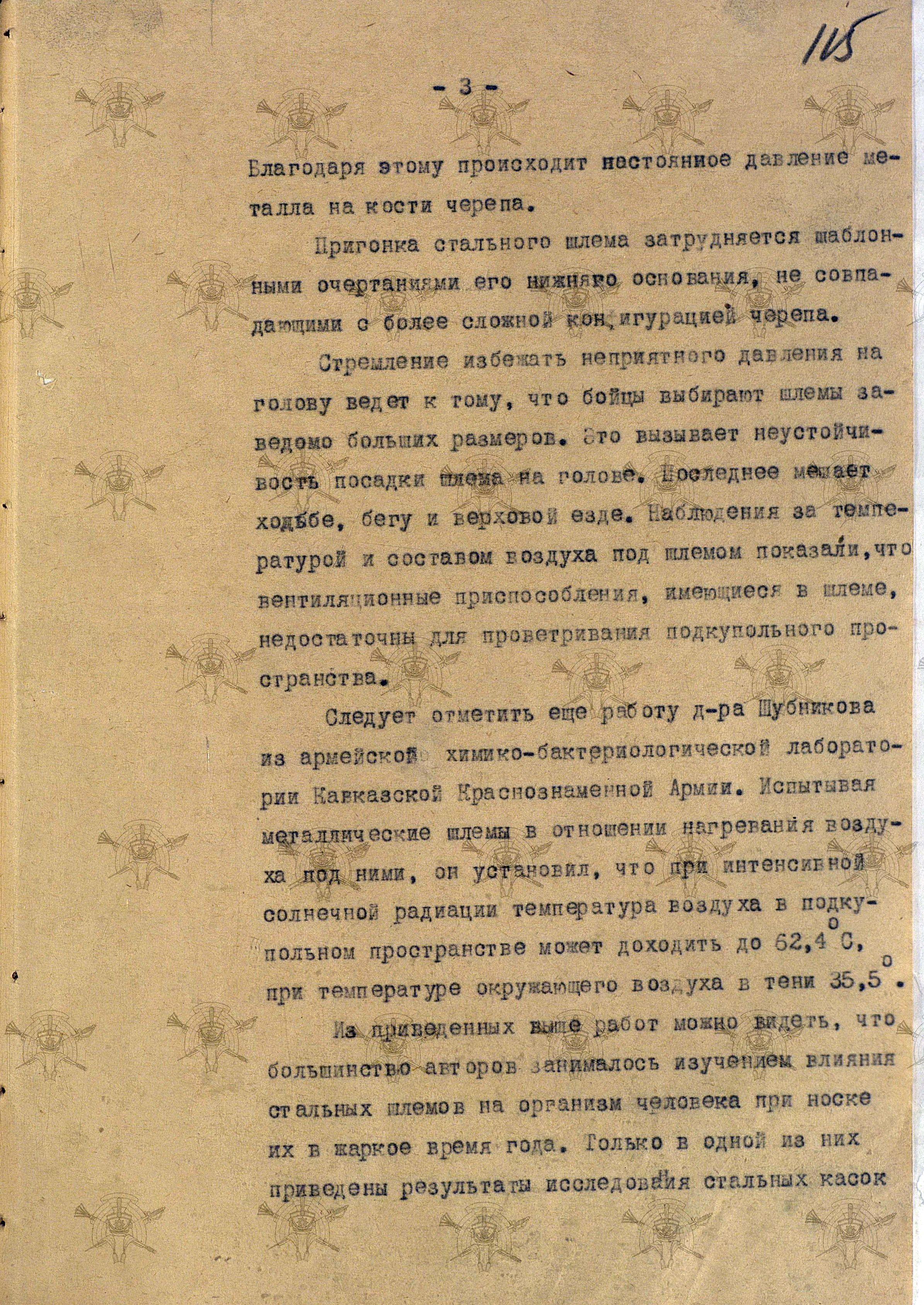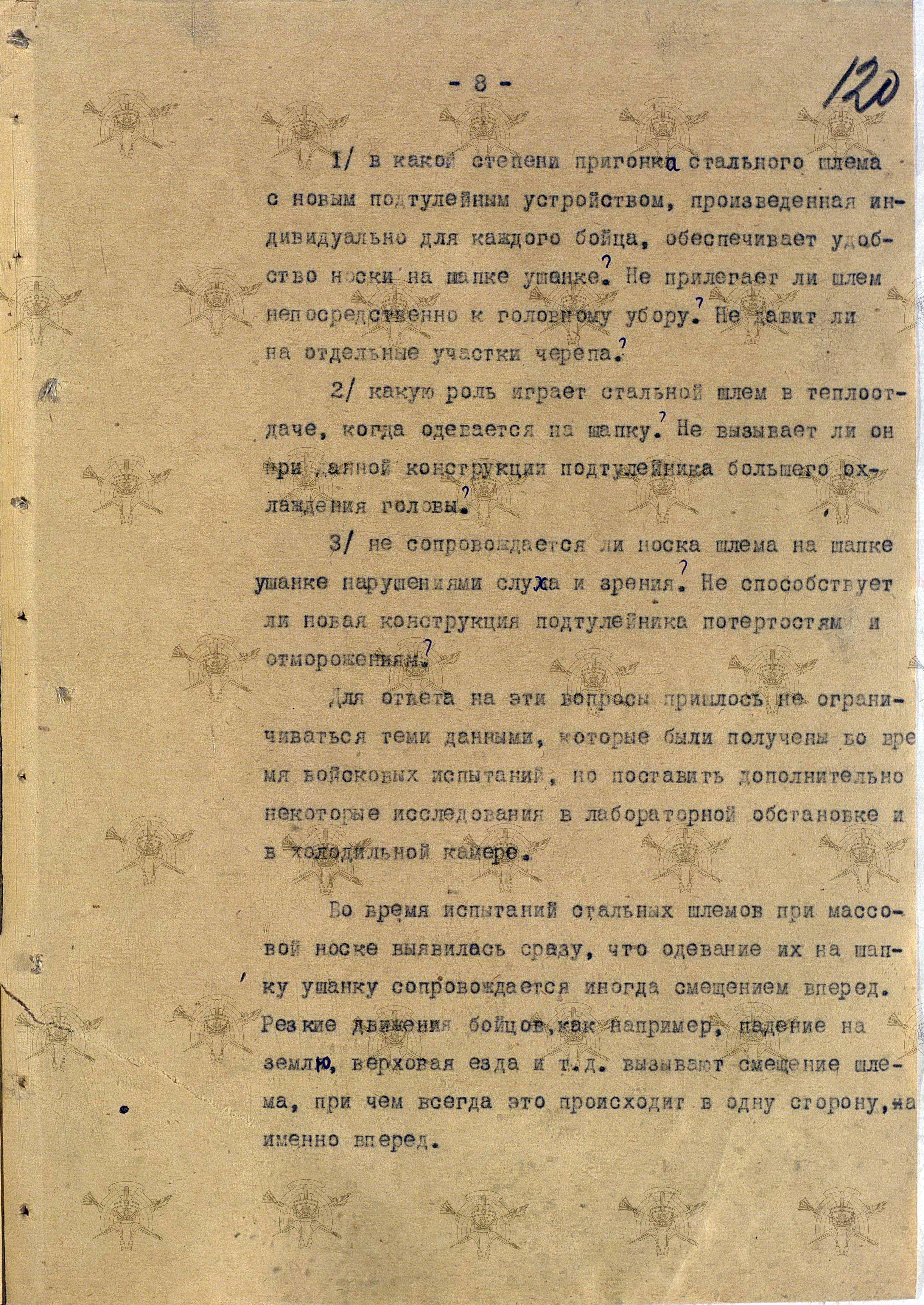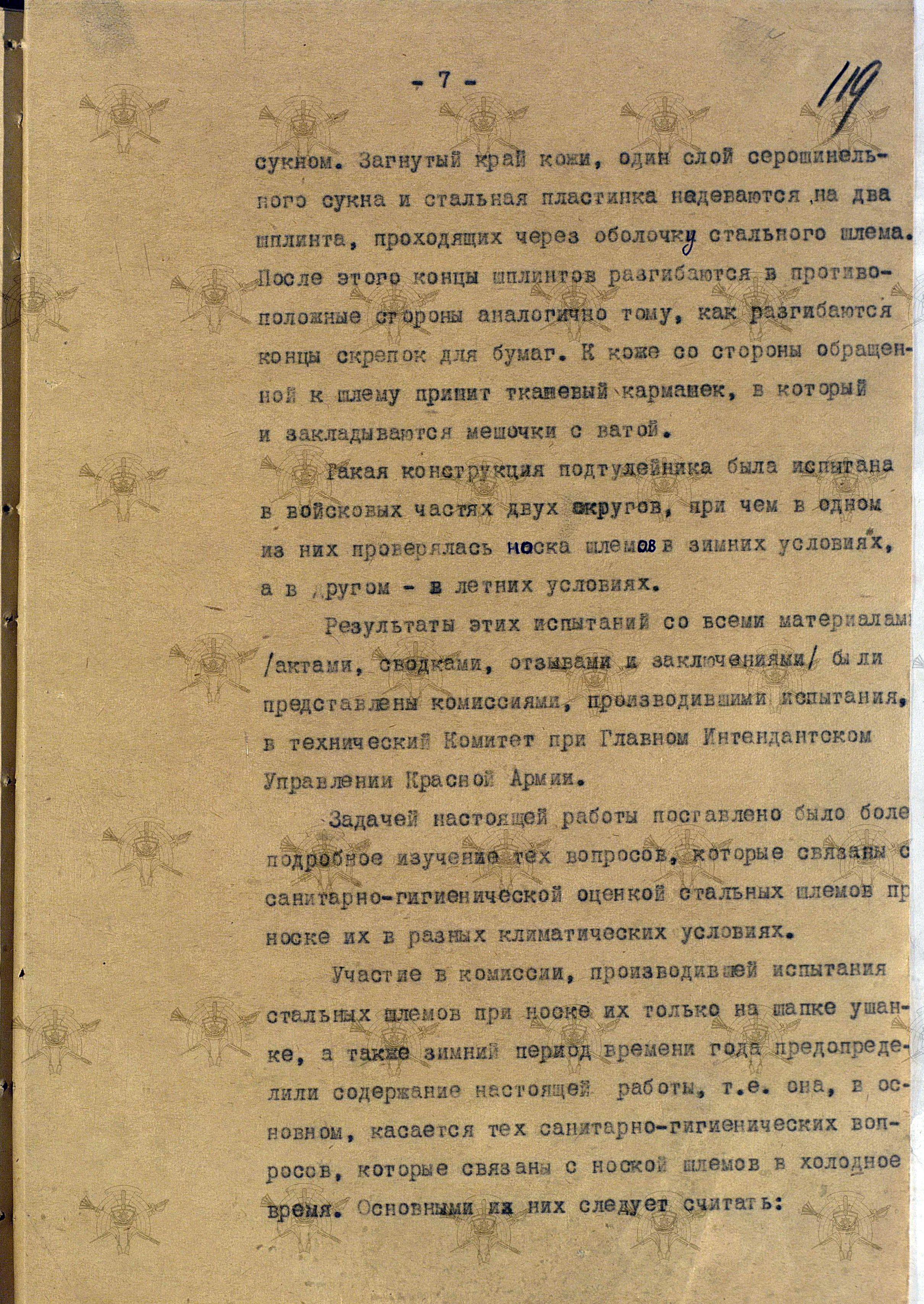 "Санитарно-гигиеническая оценка стальных шлемов с новым подтулейным устройством." 1941 г.