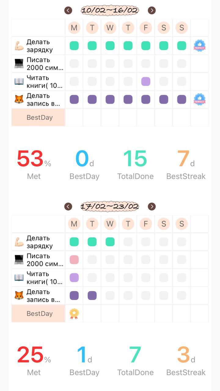 Вообще, вернувшись домой, я ожидала, что как и раньше, в отпуске, примусь за писательство, блог, чтение и любимые занятия. Как видите из скриншота ниже меня хватало только на зарядку и запись в дневник настроения...