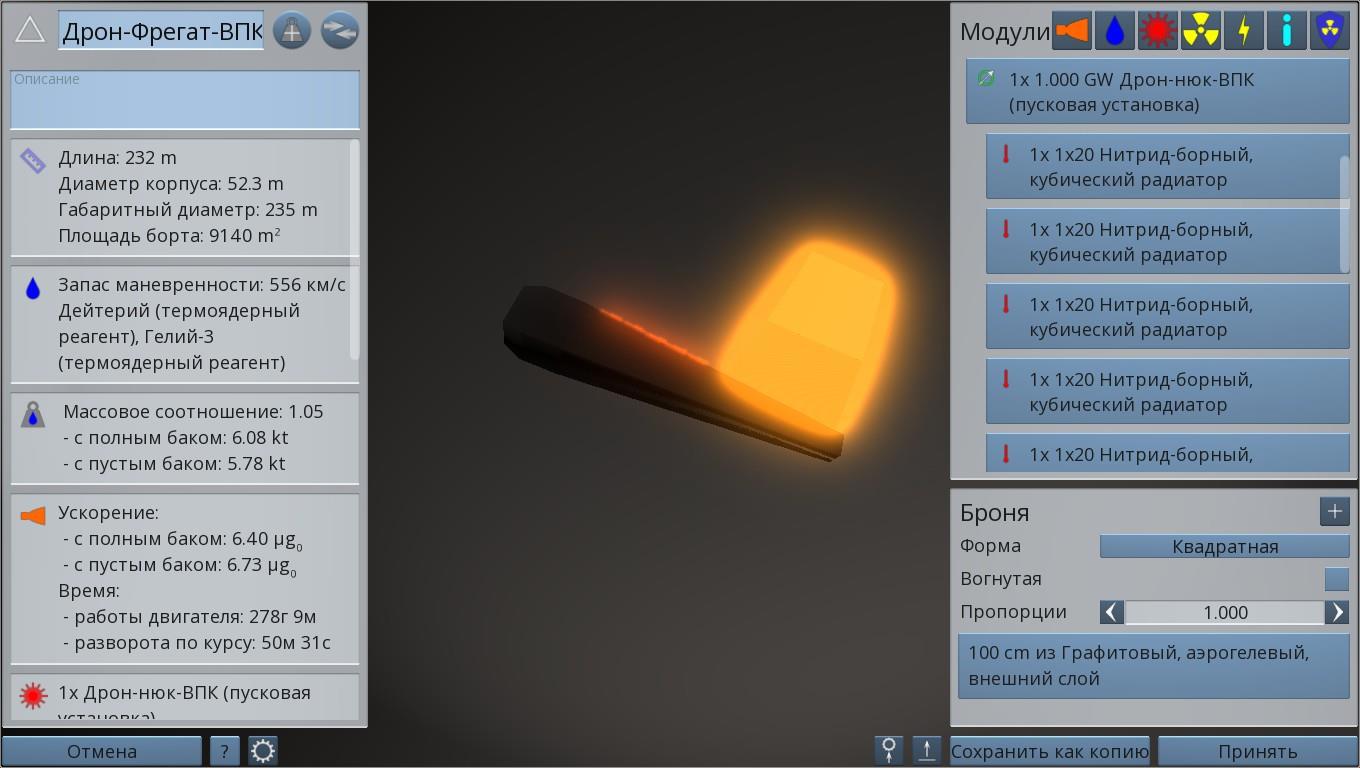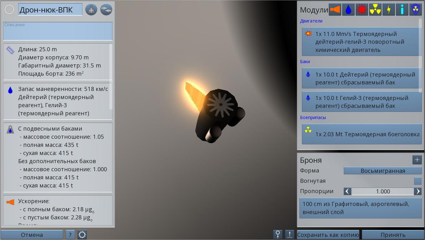 Вот это собственно и есть та самая двигательная установка для дронов высокой автономности. Немного толстенькая, так что баки с дейтерием и гелием-3 пришлось навесить снаружи, но и только. 51 мегаватт тяги или электричества, уровень предтопа оригинального проекта роскосмосовского ядерного буксира. И это всё, что я смог сделать - потому что всю полезную нагрузку имитирует стотонный контейнер в носу. Такой себе габаритно-весовой макет. А, ну да, и термоядерная БЧ, ибо канон.