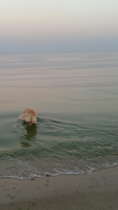 Ближе к пяти на пляж прибегает большая рыжая собака. Входит в воду, проплывает круг и выбирается на берег. В её шерсть вплетаются салатно-зелёные водоросли.