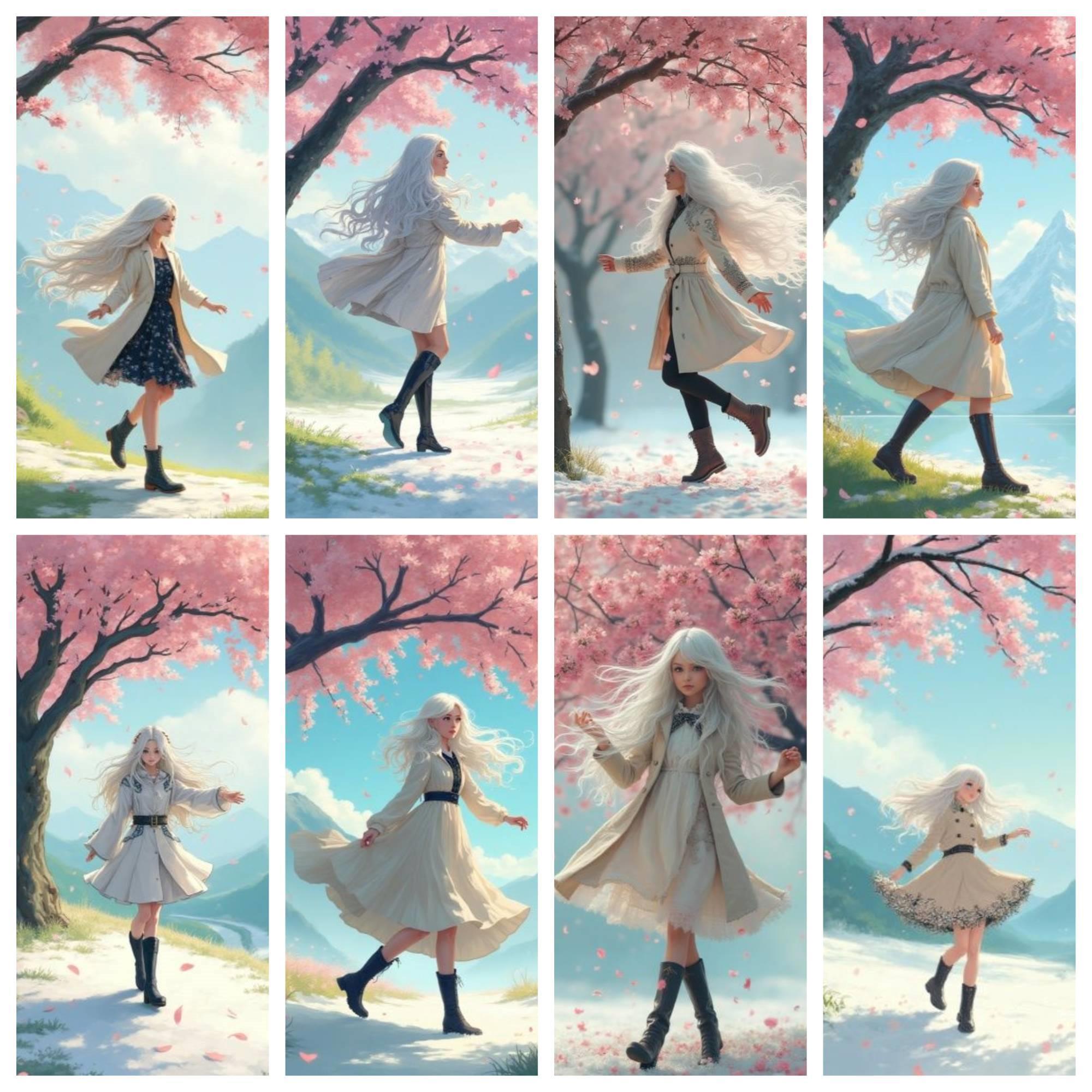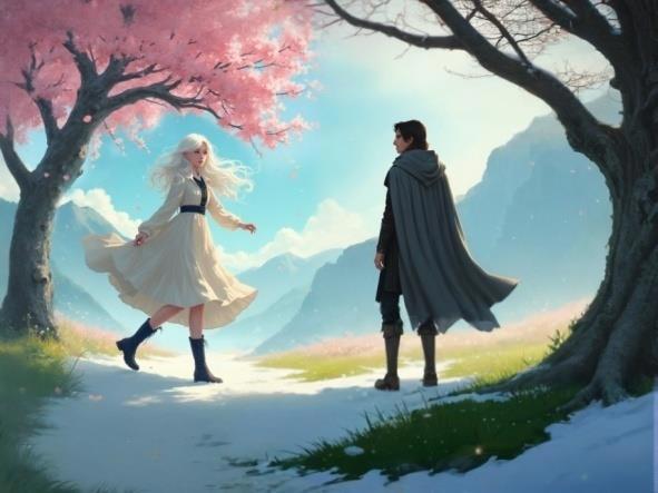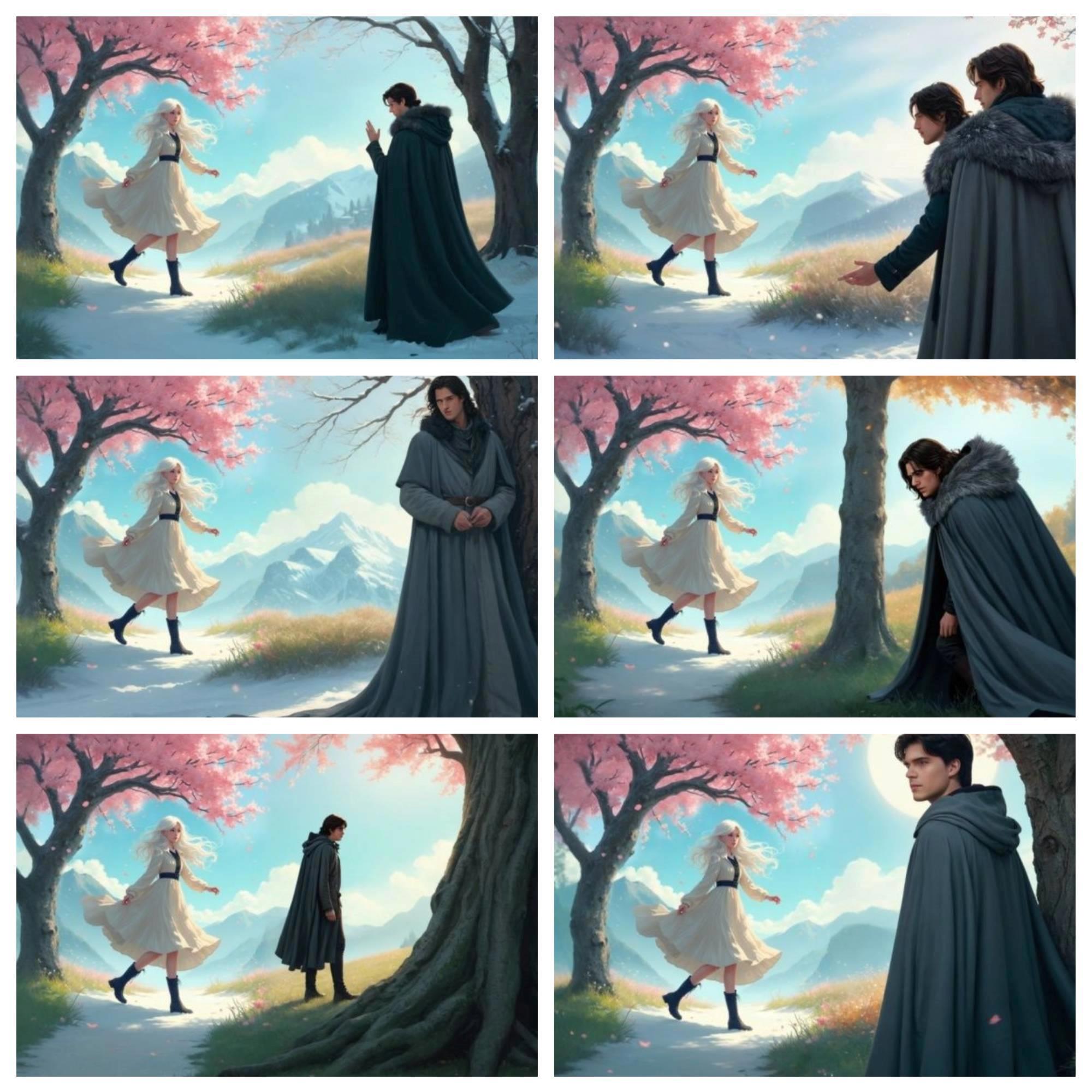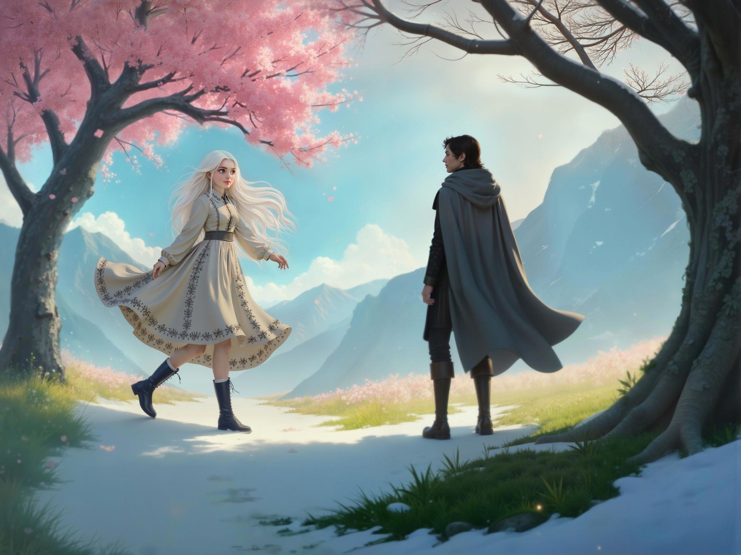 Согласно идее: девушка танцует и с помощью магии заставляет вишню цвести и плодоносить, а снег вокруг расступаться. За ней из-за дерева наблюдает второй персонаж и опасается, что она заметит его.