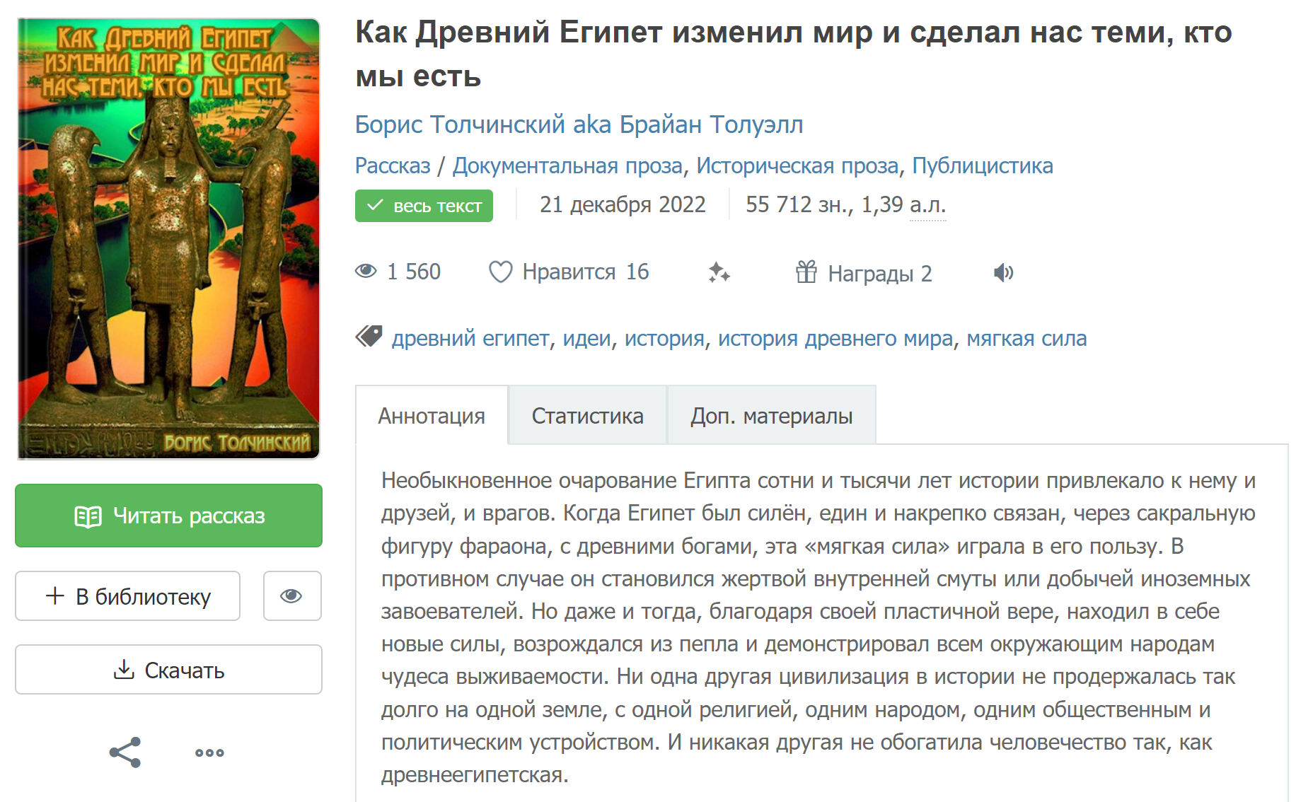 Правда, моих книг и в этой подборке предсказуемо не оказалось. Хотя почти все они так или иначе неразрывно связаны с Древним Египтом, его историей и мифологией, наследием, идеями, героями. В чём нетрудно убедиться, прочитав их! Или даже не читая, если так уж лень – просто взглянув на обложки и аннотации. Без Древнего Египта эти книги не родились бы. Я, со всеми своими работами, чувствую себя наглухо, ещё при жизни, замурованным в гробницу из пренебрежения и равнодушия. И её, в отличие от гробницы фараона, так и не открыли. Может быть, через три с половиной тысячи лет…