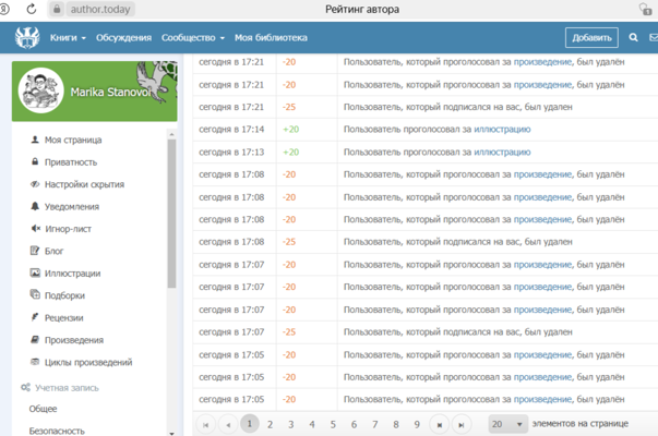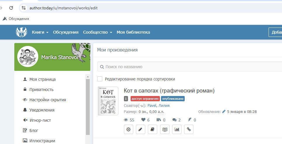Ибо от ботов у меня никакого шквала минусей не было. Оно на общем фоне плюсей проскочило незаметно. А тут всё-таки Pavel ушел (который стихами писал Кота в сапогах и Кошку в сапожках и которому я рисунки делала https://author.today/art/182691 . но книгу сдублировать ему иак и не дали. Хотя он сам свой первый профиль снёс вместе с первой публикацией Кота, А тут прийдя снова на сайт захотел снова опубликовать, а шиш).