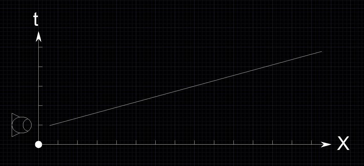 Наш корабль опять движется по прямой, как в первом случае, но теперь мы следим не только за расстоянием, но и за временем. При этом движение во всех трёх случаях остаётся одинаковым: везде корабль движется по прямой в одном и том же направлении относительно системы отсчёта.