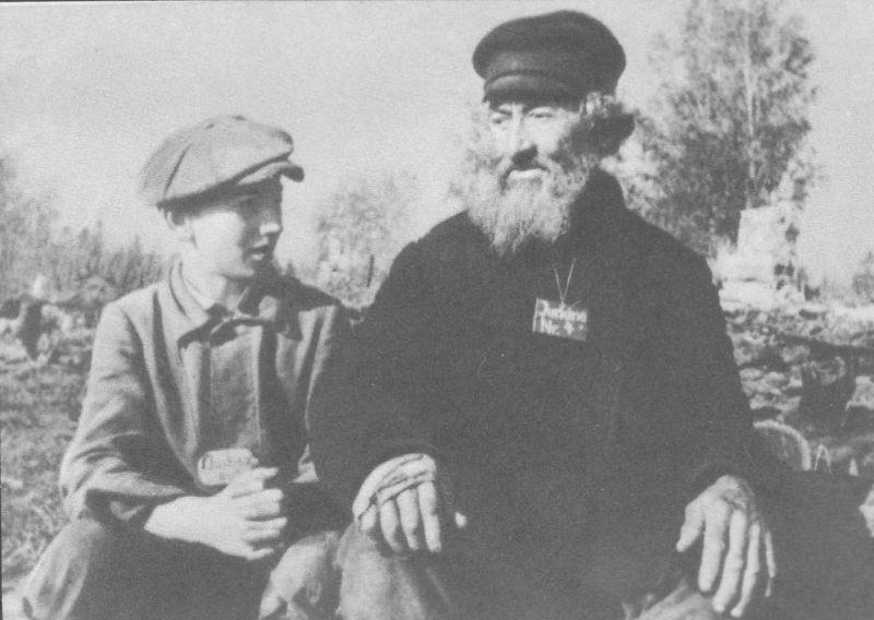 Жители деревни Юркино с табличками на шее после освобождения их деревни от немецкой оккупации. В оккупированных деревнях захватчики обязывали местных носить бирки на шее с указанием места проживания.