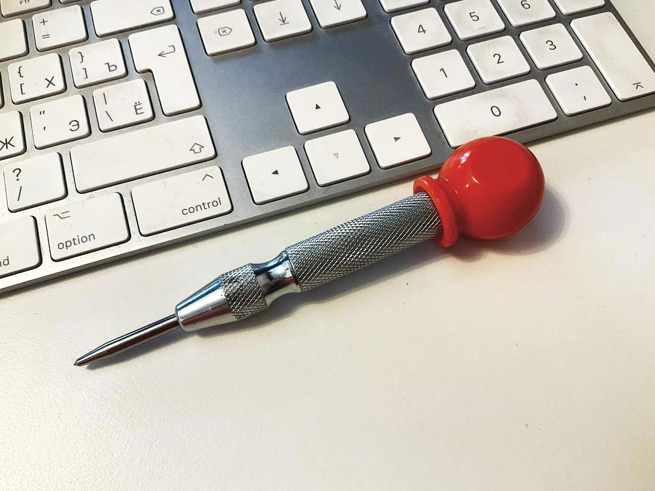 Пришел в магаз забирать заказ. Гляжу - странная штучка, как-то на него надо надавливать. Как оказалось позже, при нажиме в нем взводится пружина, потом освобождается, и заостренный боек фигачит со всей дури в то место, куда мы боек приложили.