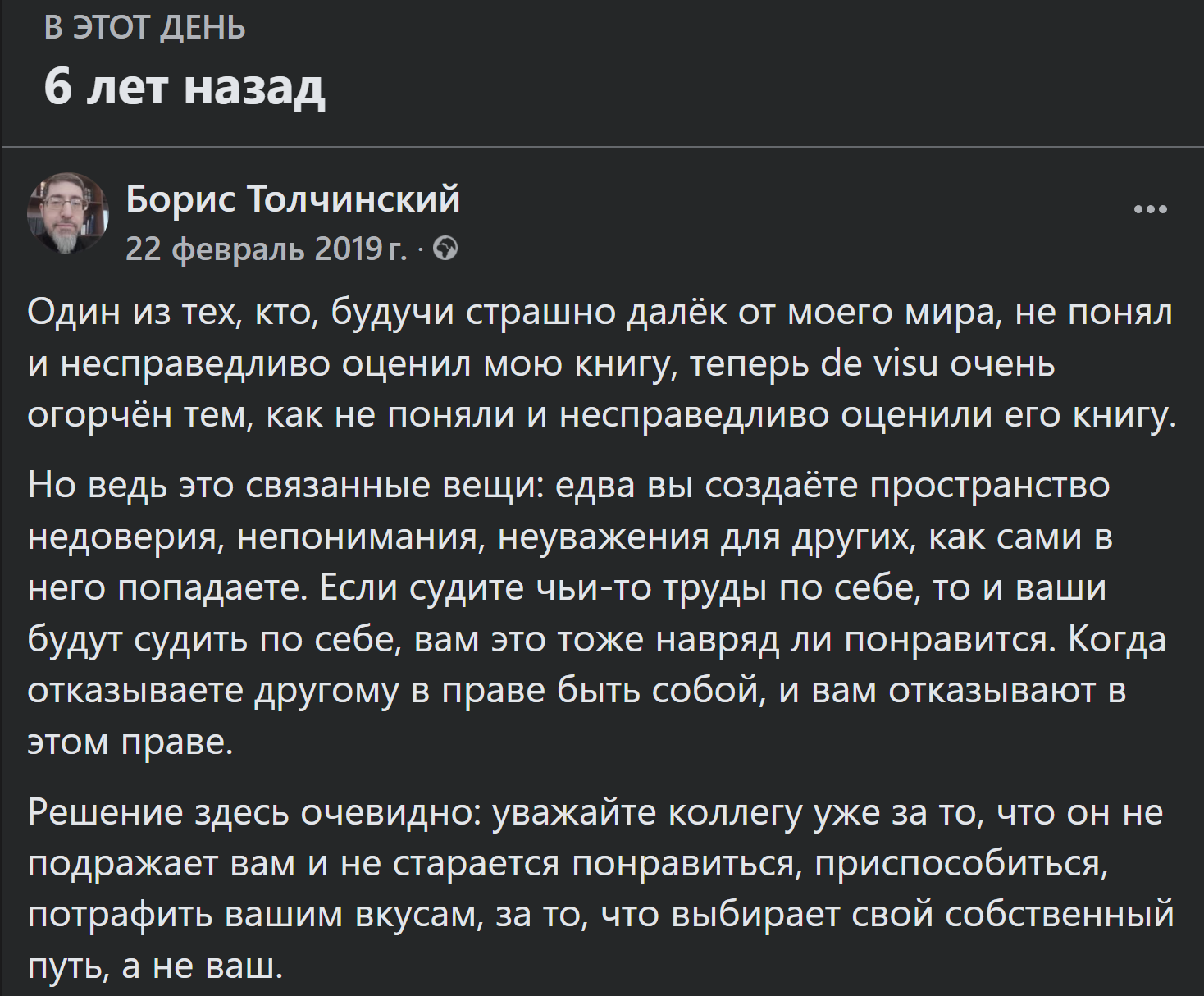 Но ведь это связанные вещи: едва вы создаёте пространство недоверия, непонимания, неуважения для других, как сами в него попадаете. Если судите чьи-то труды по себе, то и ваши будут судить по себе, вам это тоже навряд ли понравится. Когда отказываете другому в праве быть собой, и вам отказывают в этом праве.