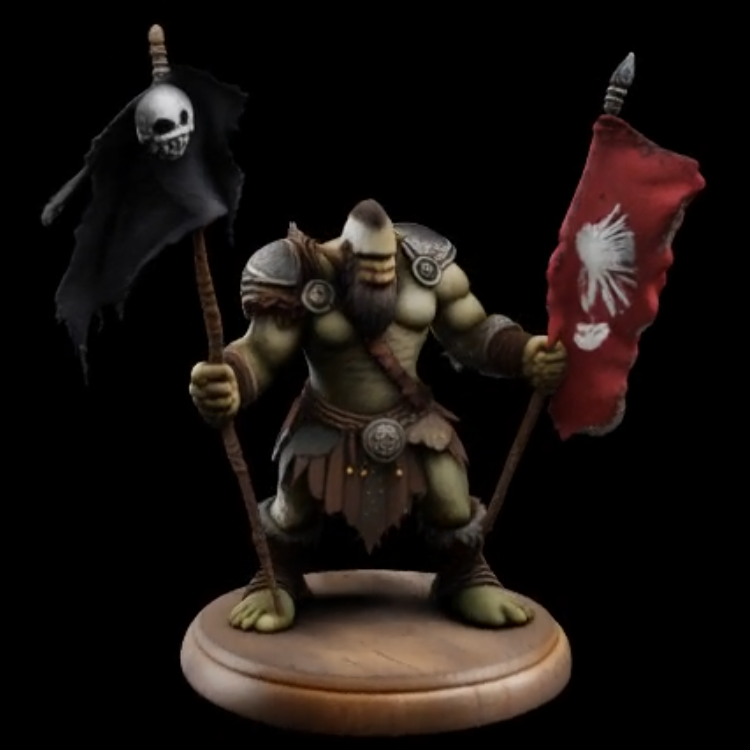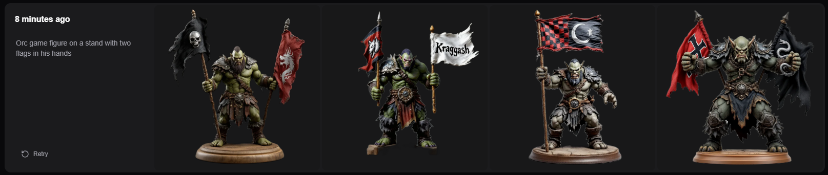 Итак, мы зарегистрировались в сервисе и видим перед собой строку ввода промта - описания того, что вы хотите получить, на английском. Подойдёт то, что вам накашеварит гугл.транслейт. У нас это будет фигурка орка с двумя флагами в руках, что б нейронке жизнь мёдом не казалась. Вводим промт, жмём, минута - и перед нами "меню":