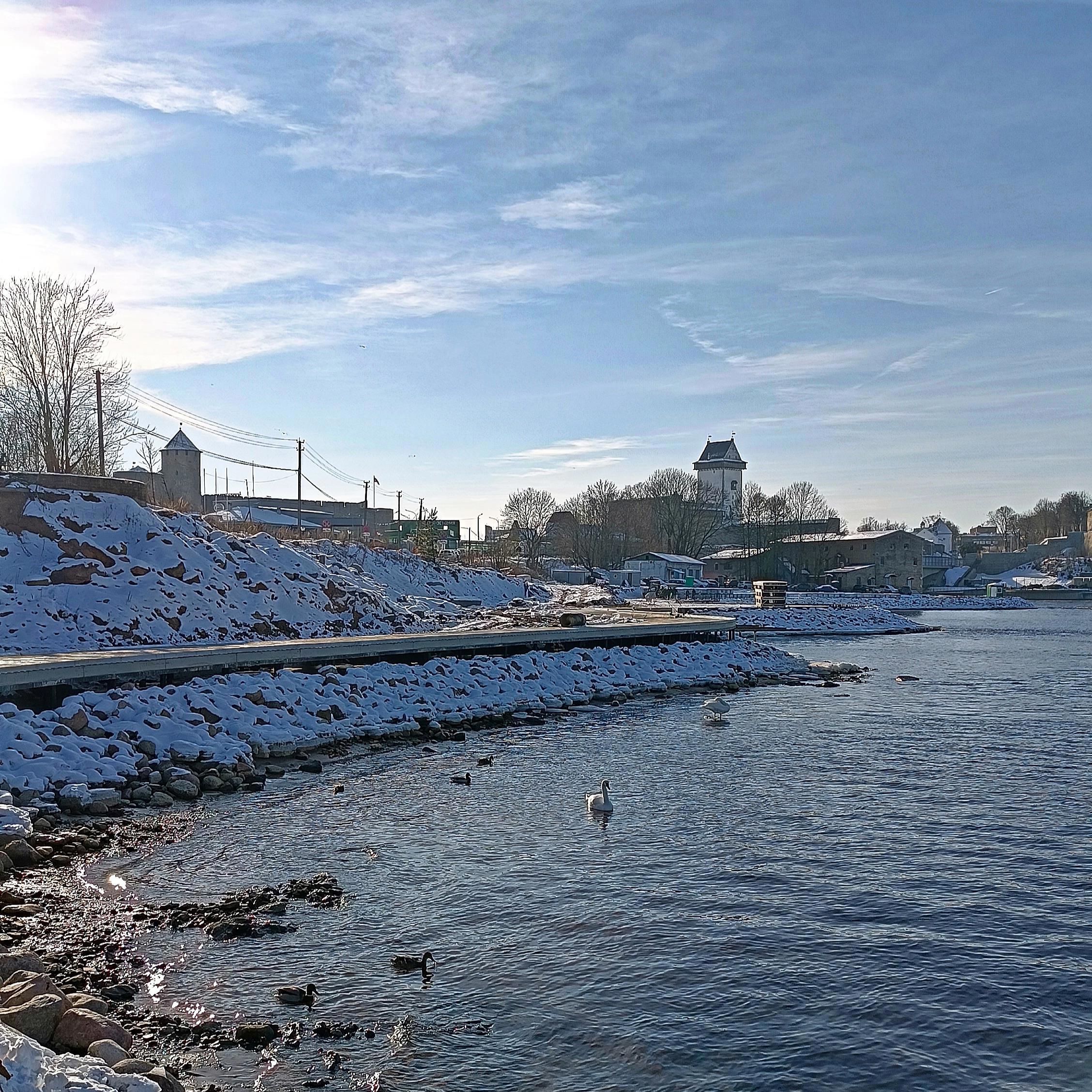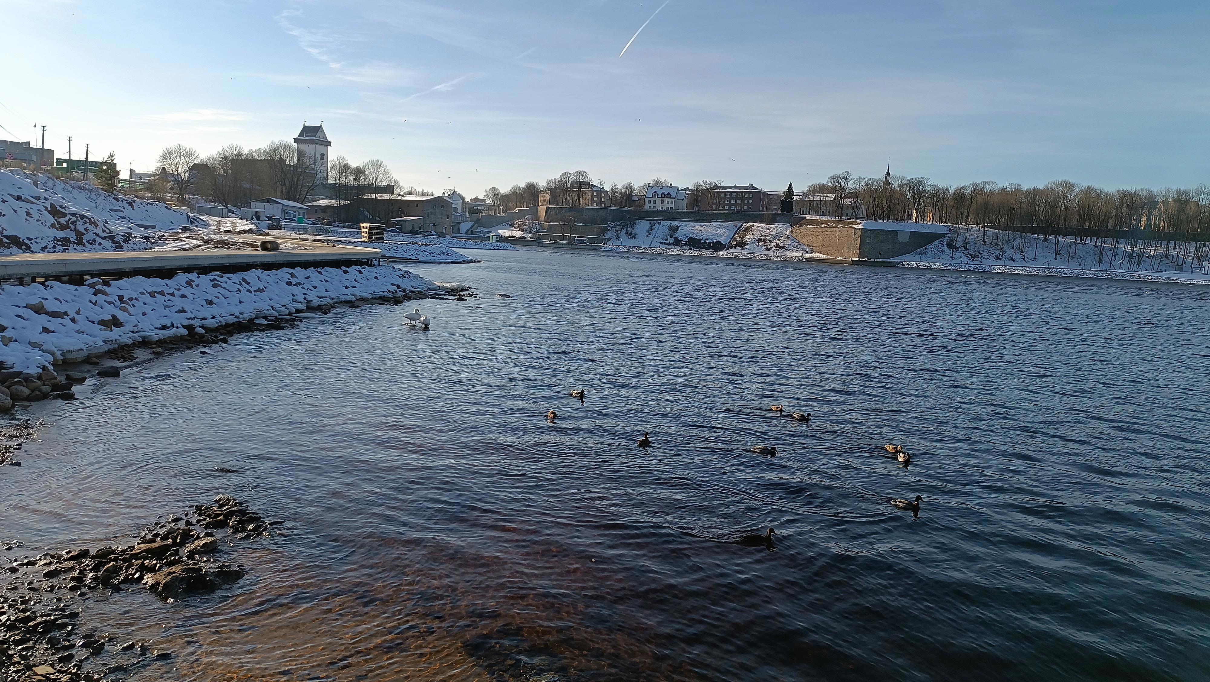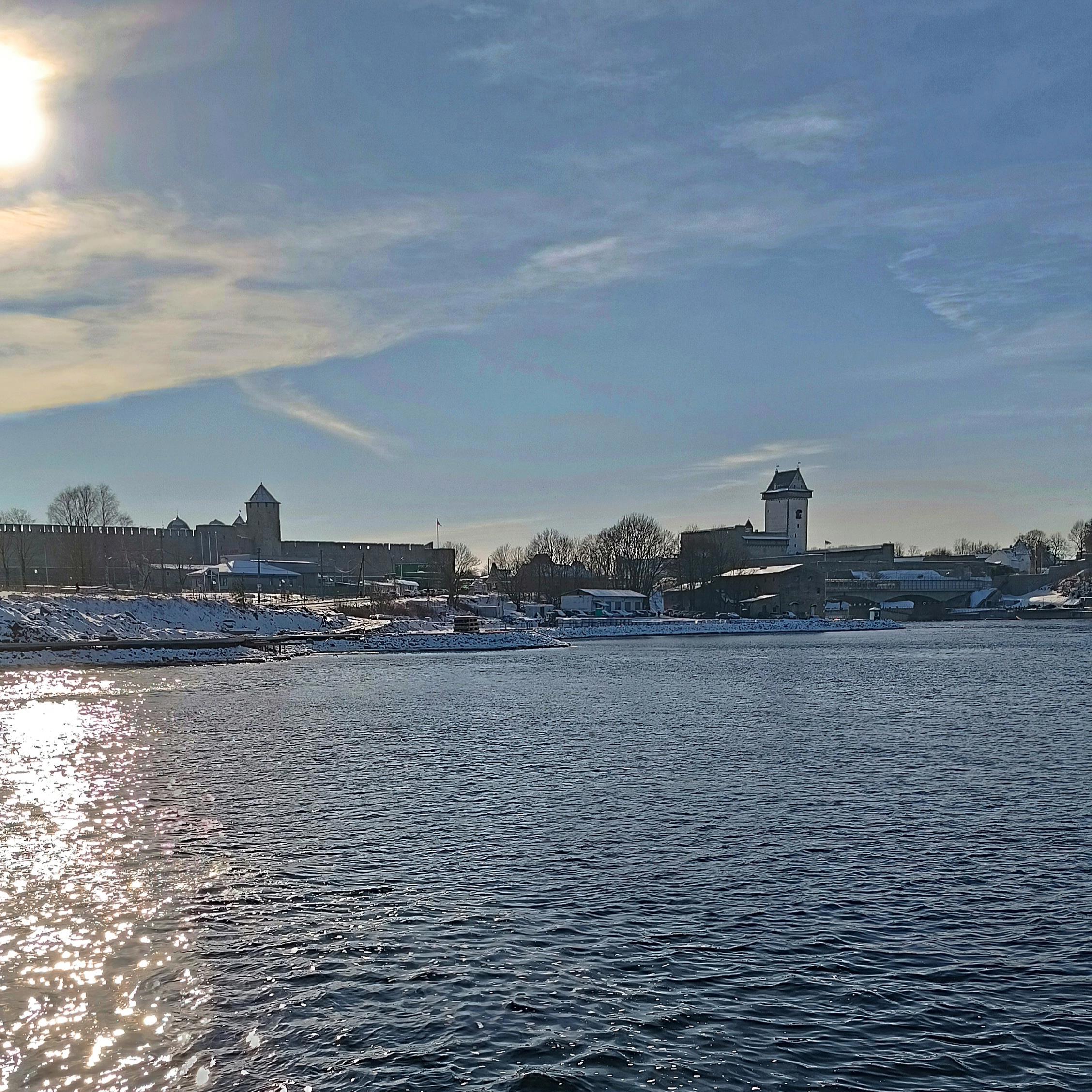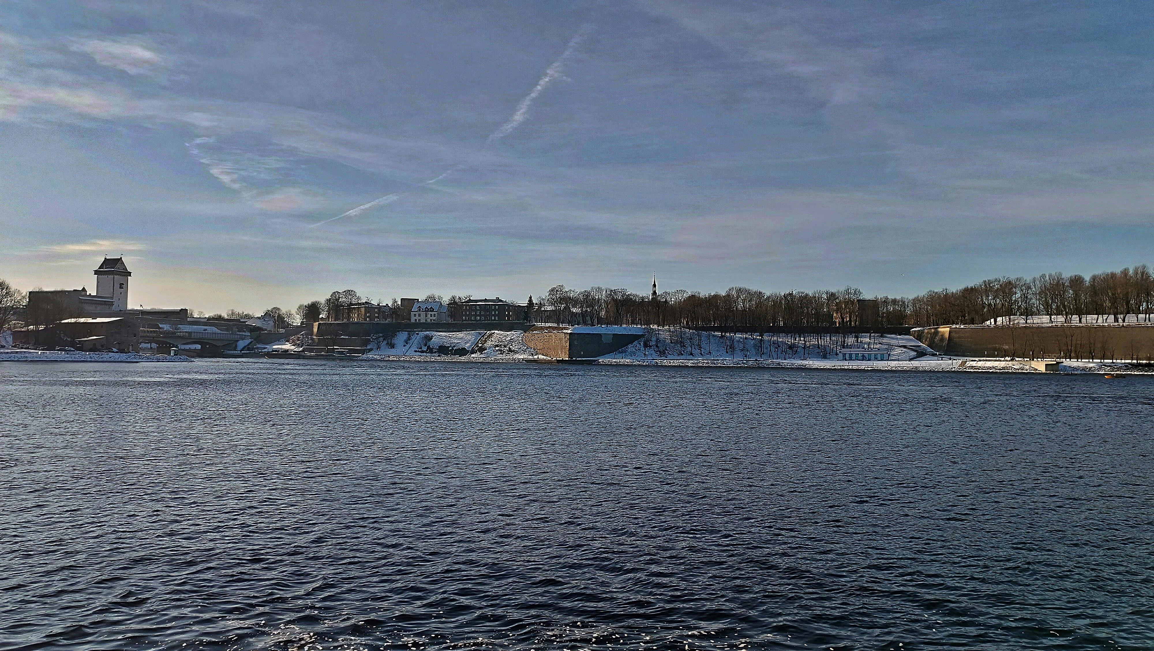 Река Нарва (теперь стали на картах писать Нарова), которая есть граница. Крепость и замок как раз рекой и разделены: