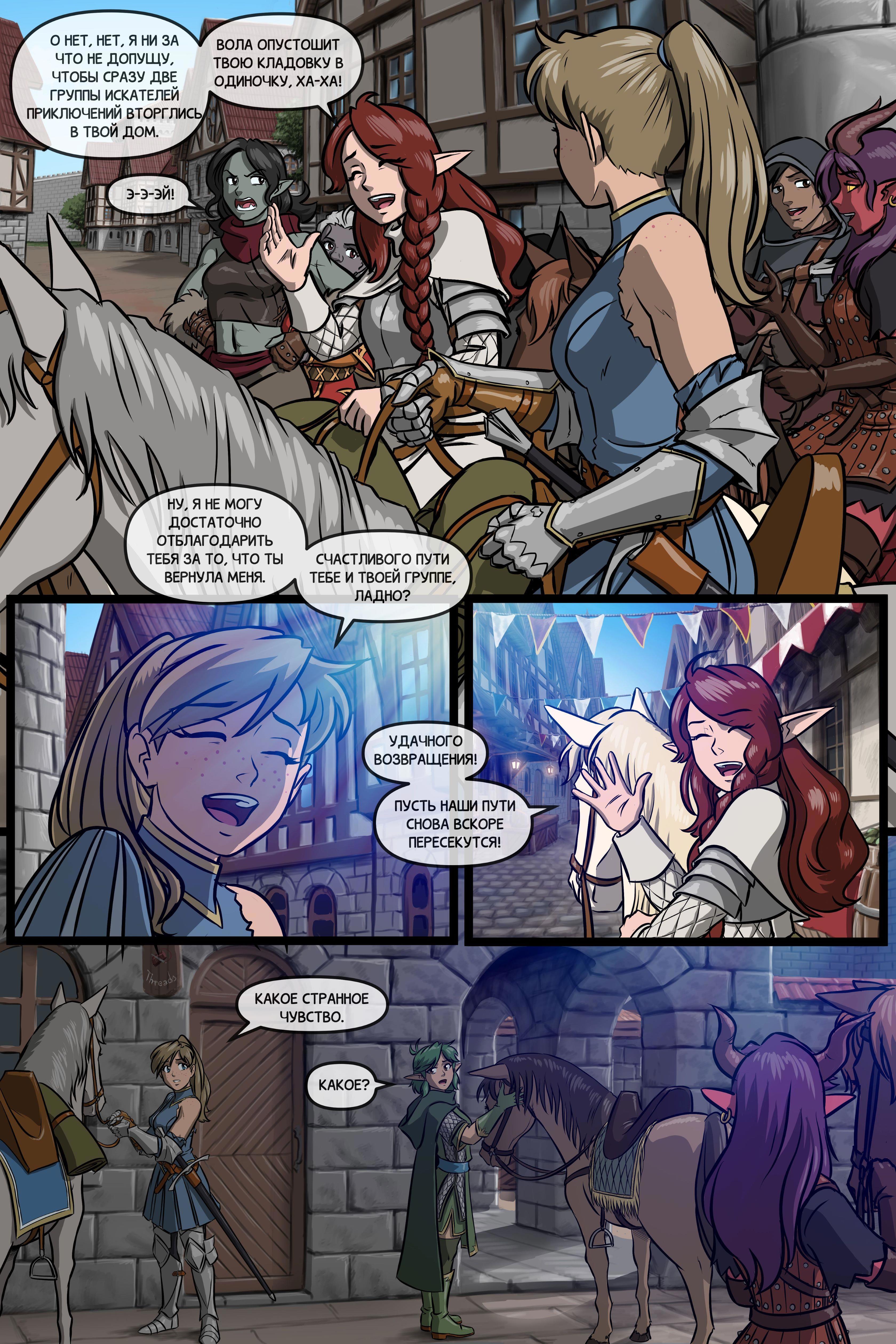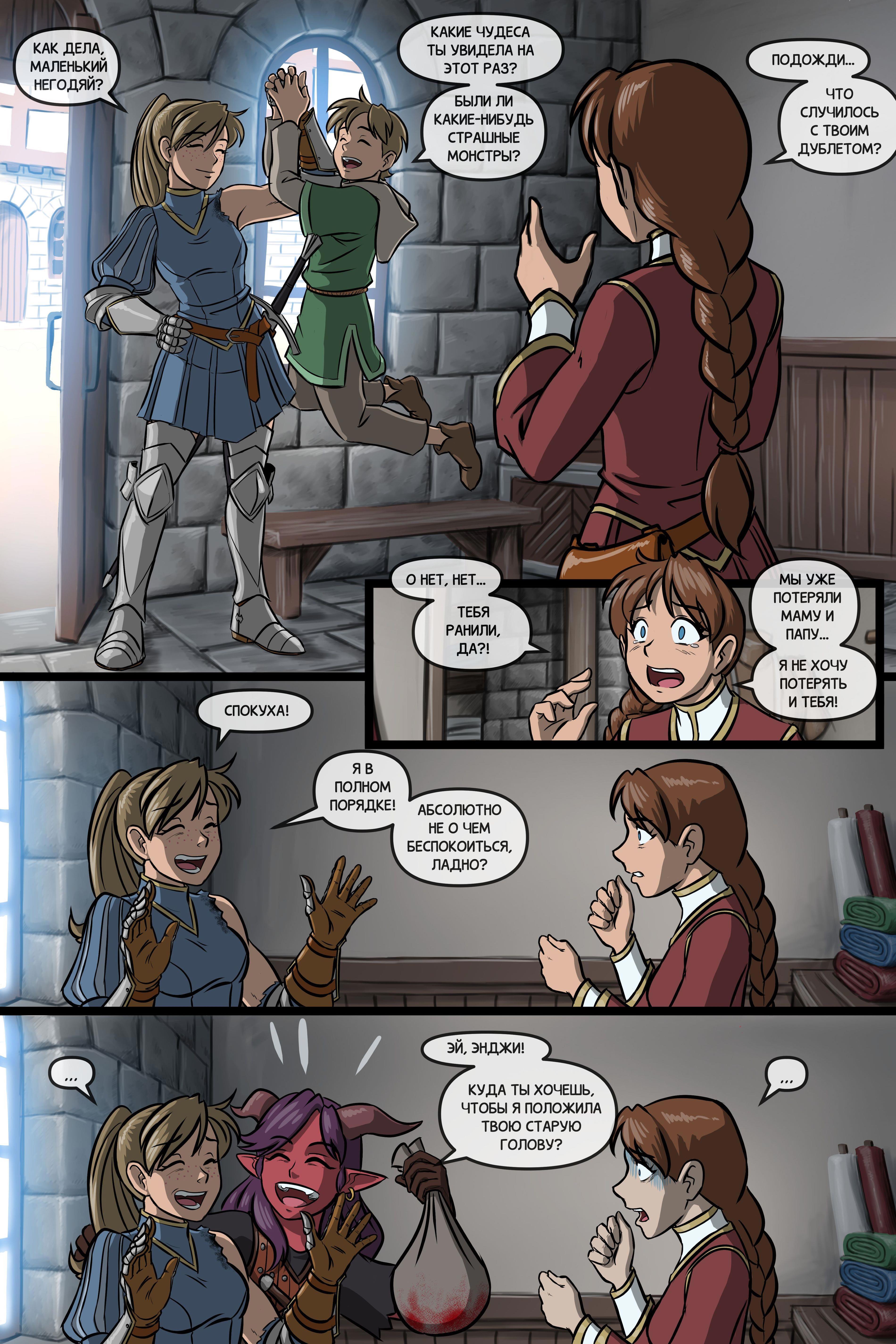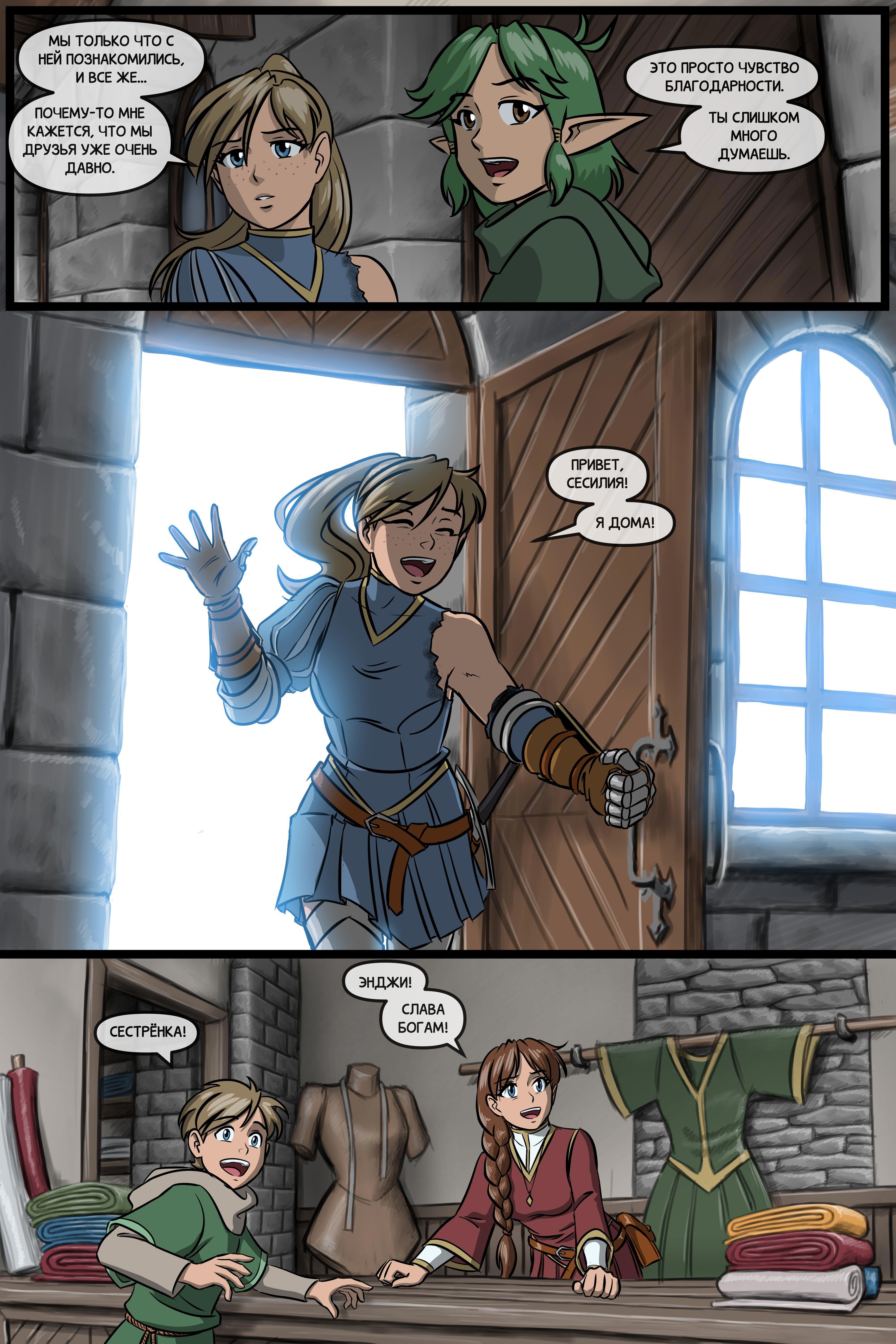 Автор: Руслан БирюшевК этому выпуску небольшое пояснение - рыжая эльфийка является персонажем настольной партии, в которую играл автор. И там она знакома с Энжи, и они действительно подруги. Но у комикса свой параллельный мир и сюжет, к чему и ведут слова Ангелы.