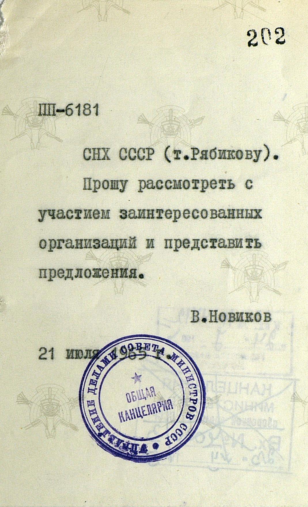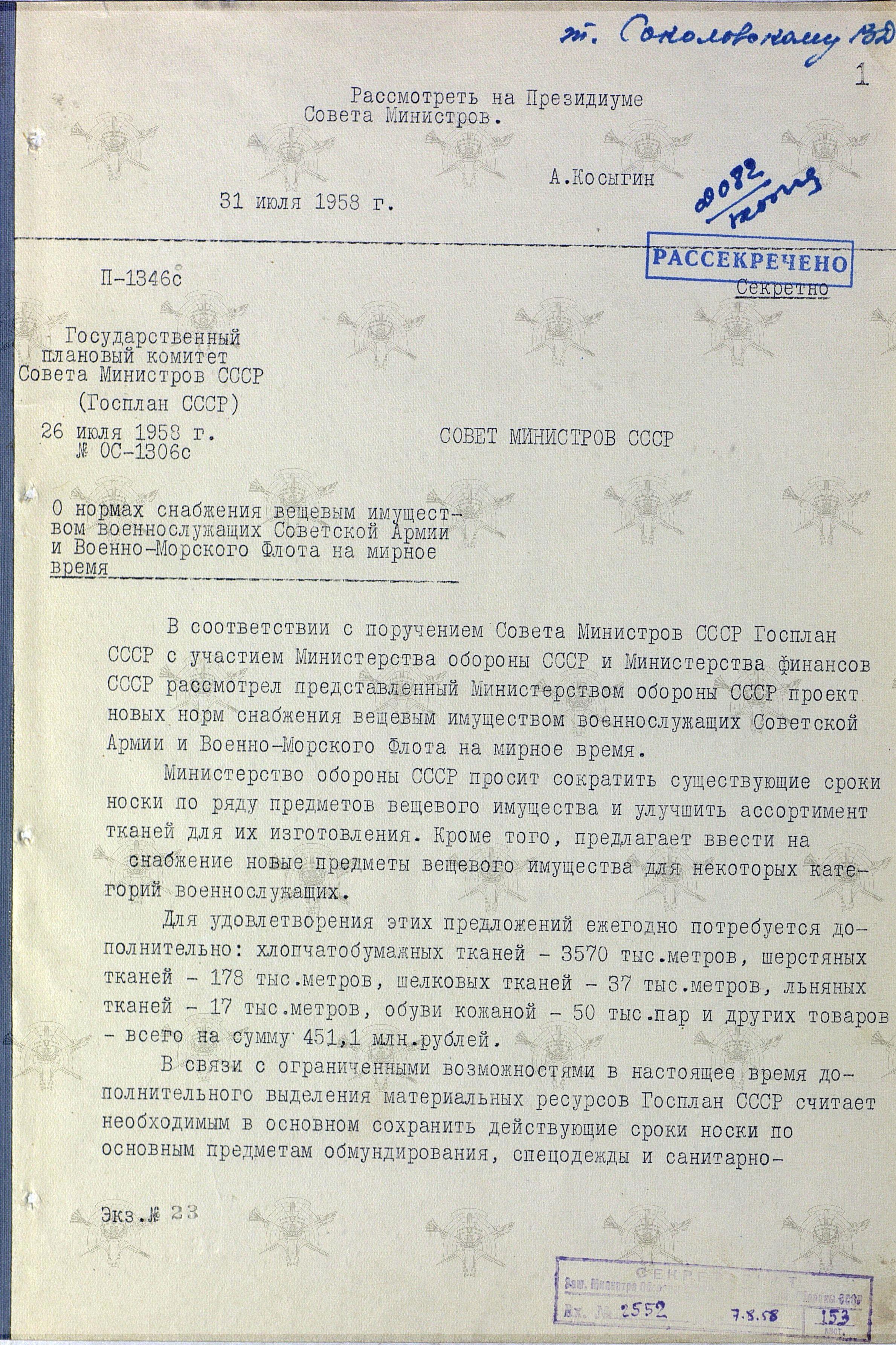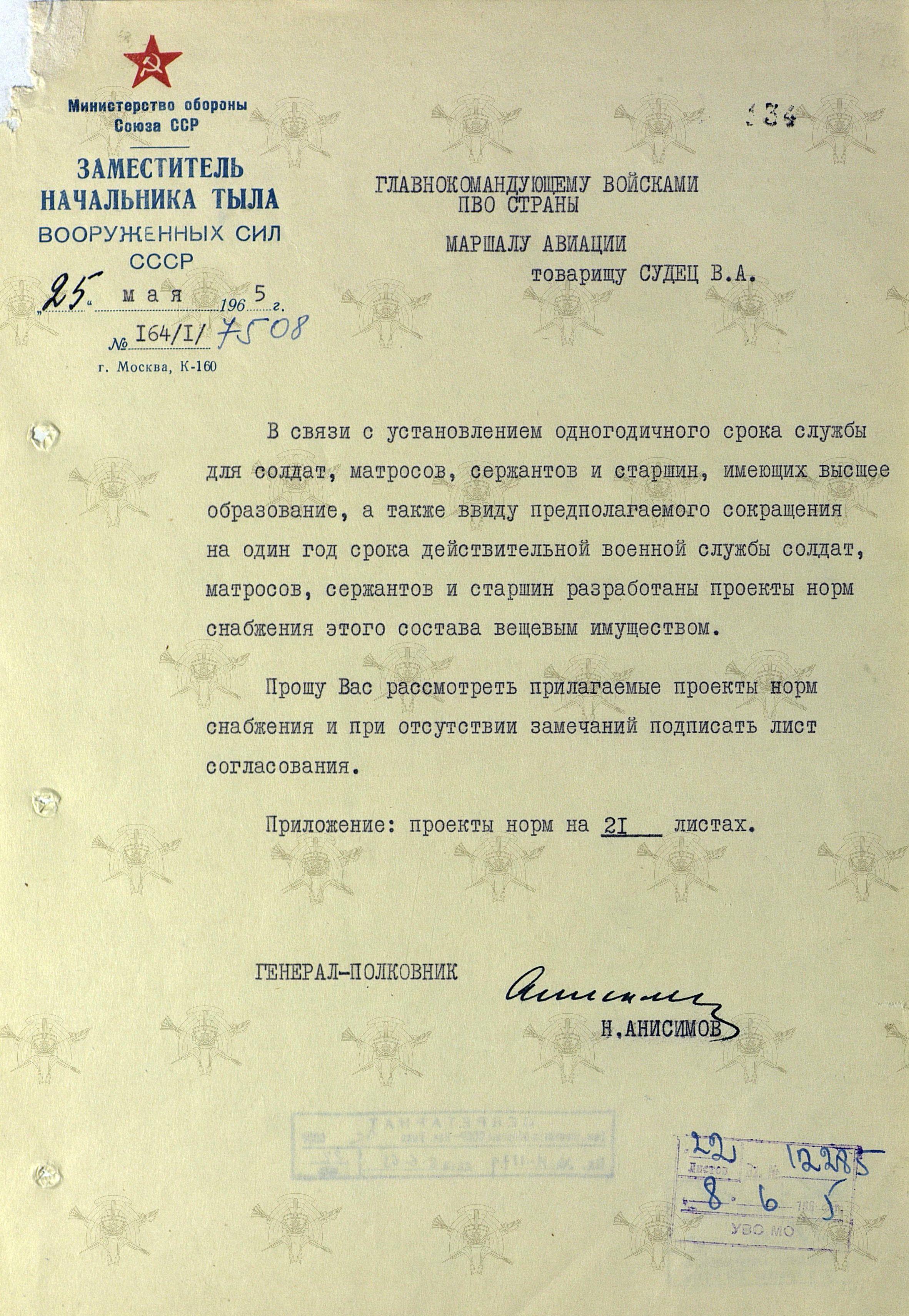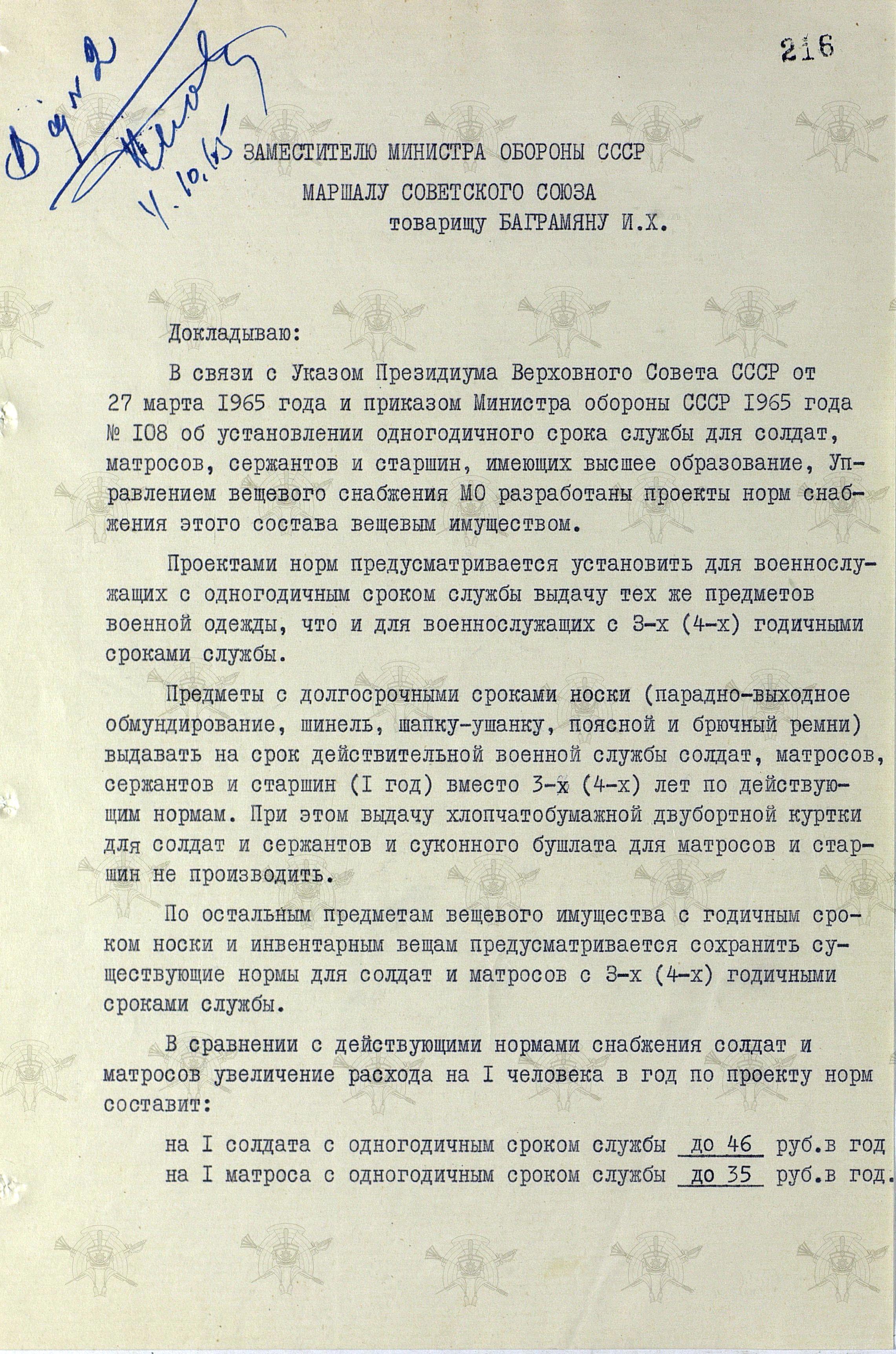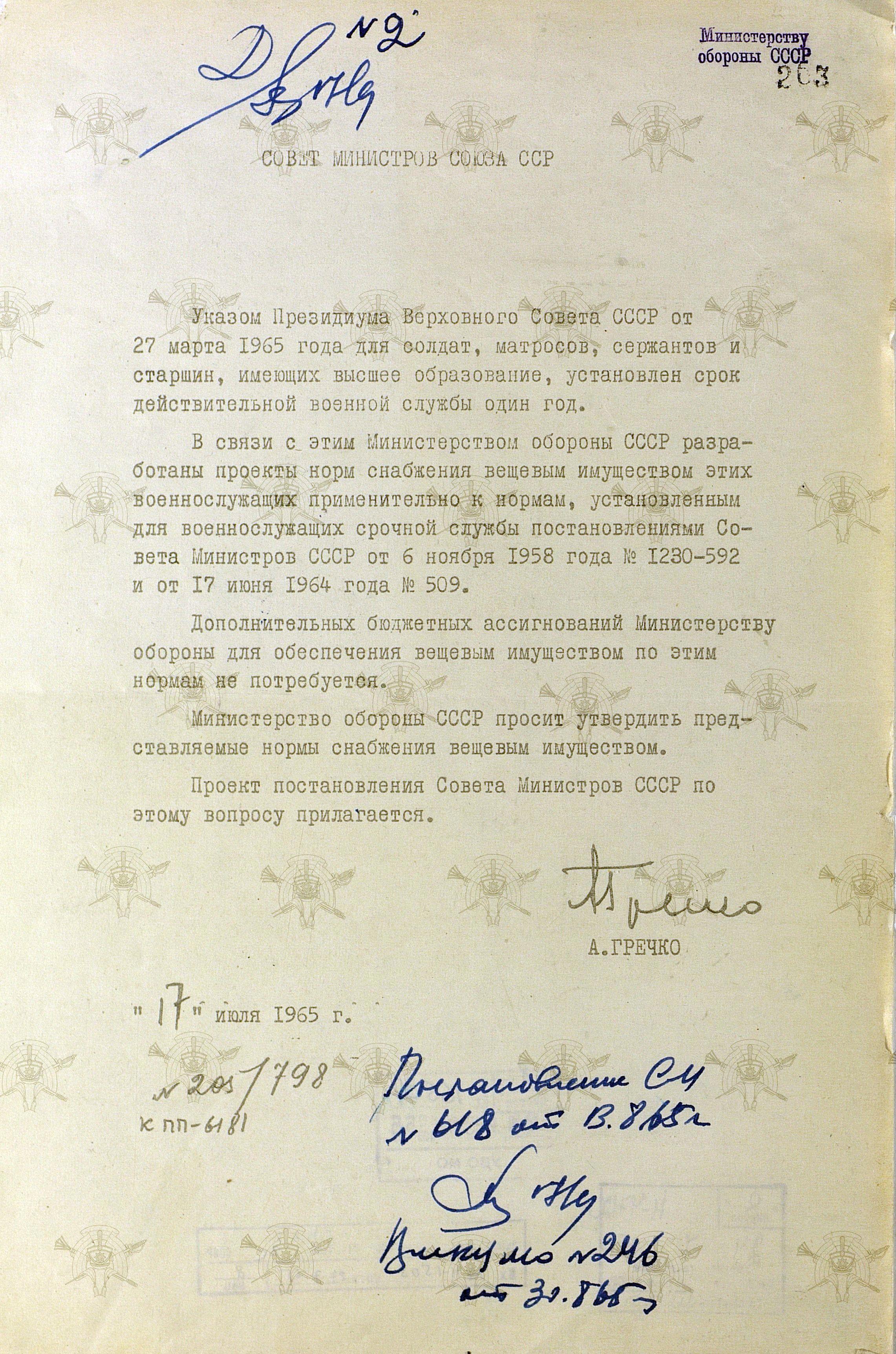 Как видно из рукописной пометки, предложения Минобороны были приняты. 13 августа 1965 года было принято постановление Совмина СССР № 618, а 30 августа - издан приказ МО СССР № 246, устанавливающий нормы снабжения военнослужащим, срок срочной службы которых составил один год.