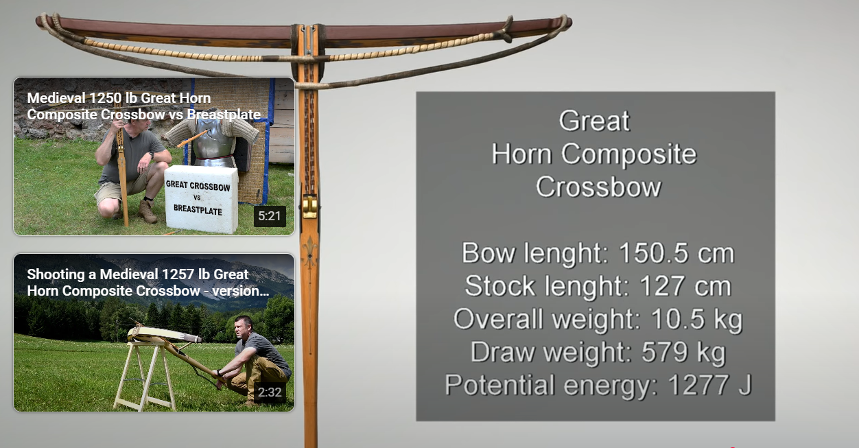 Впрочем, такой арбалет все равно для своего времени оружие ультимативное. На дальности в 250 метром стрела имеет энергию около 300 джоулей, этого достаточно для пробития доспехов с достаточным запреградным действием. Незащищенному человеку хватит для сквозного пробития. Скорее всего болт пройдет навылет.