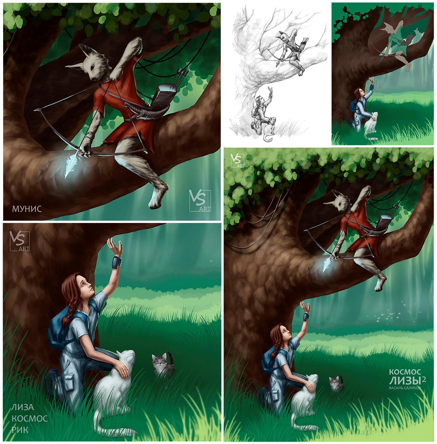 Автор: Салихов ВасильДа, именно долгой, поскольку потратил на нее около 2х недель урывками в свободное время. Куча эскизов, замена ракурса, постоянно меняющаяся концепция, все это было, наверное потому что делал ее для своего романа "Космос Лизы 2". Но к работам для других авторов стараюсь подходить не менее скрупулезно. В общем, вот что получилось в итоге. На коллаже слева два увеличенных изображения основных героев, а справа внизу конечный вариант иллюстрации.