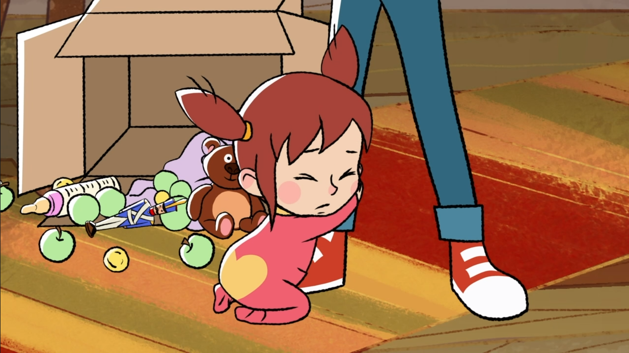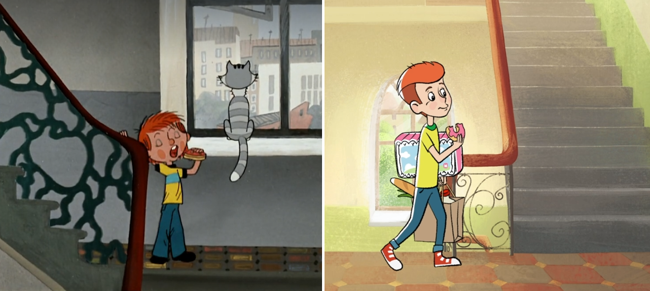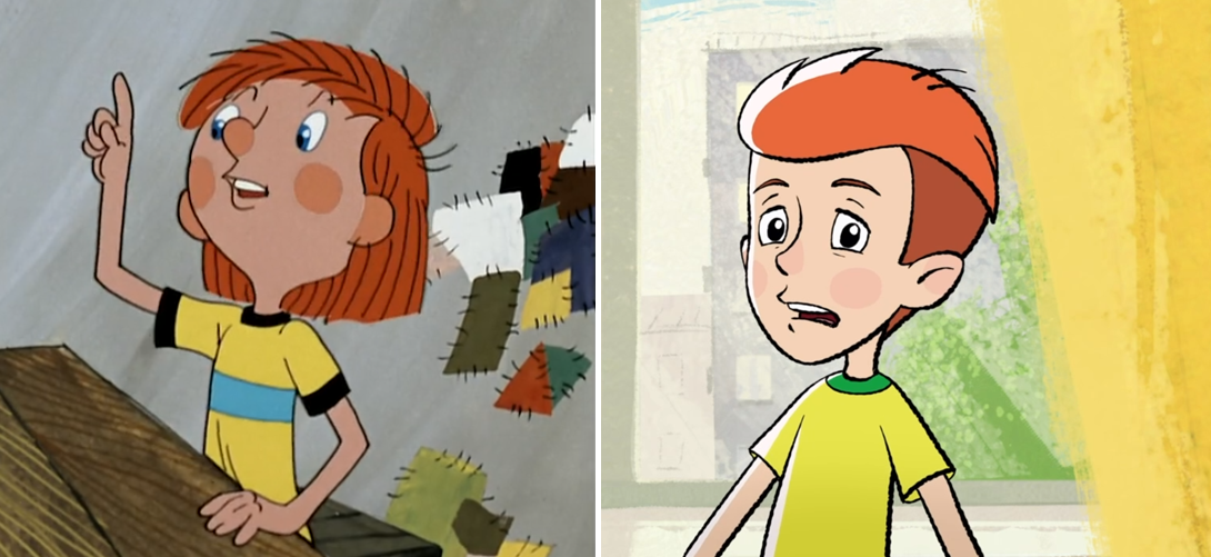 Для начала стоит отметить, что персонаж значительно старше — это без пяти минут подросток. Сравнение кадров показывает довольно существенную разницу в возрасте. Списать различия в росте и пропорциях тела на другой стиль было бы сложно, поскольку очевидно, что он здесь преемственный. Впрочем, делать это без надобности, ведь изменение внешности персонажа полностью соответствует хронологии. Никаких проблем тут действительно нет.