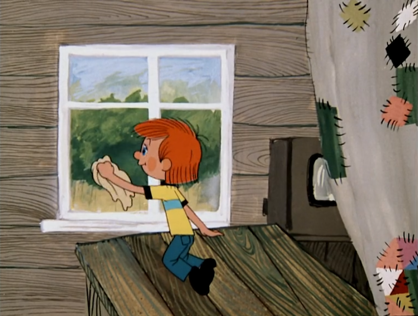 Он довольно ловко управляется со шваброй и самостоятельно моет окно.