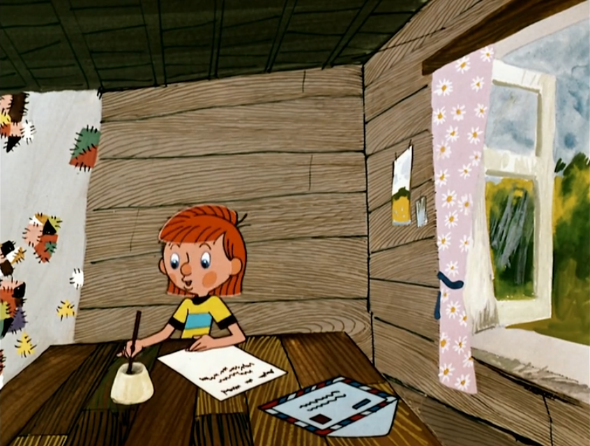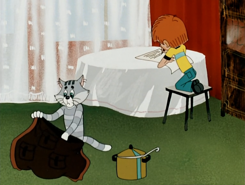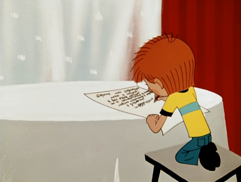 Данная сцена не только показывает, что Дядя Федор умеет писать, но и демонстрирует нам, как именно он это делает. Кадр доносит, что у «детсадовца» почти каллиграфический почерк.