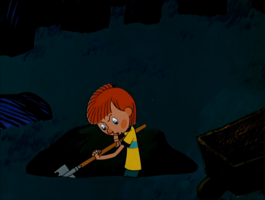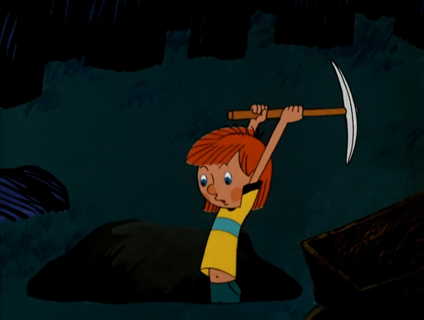 В мультфильме также показано, что дошкольник умеет обращаться с киркой.