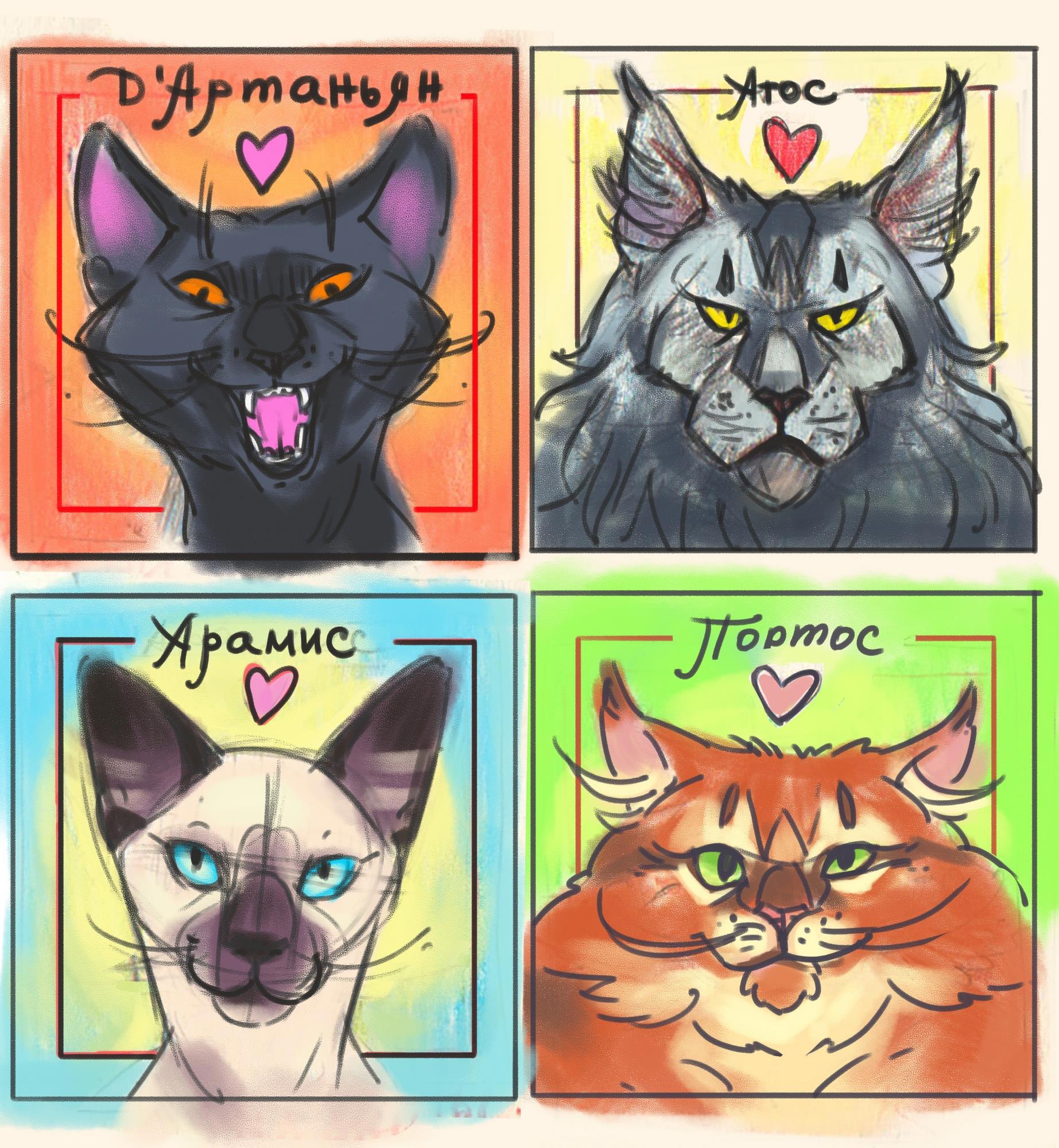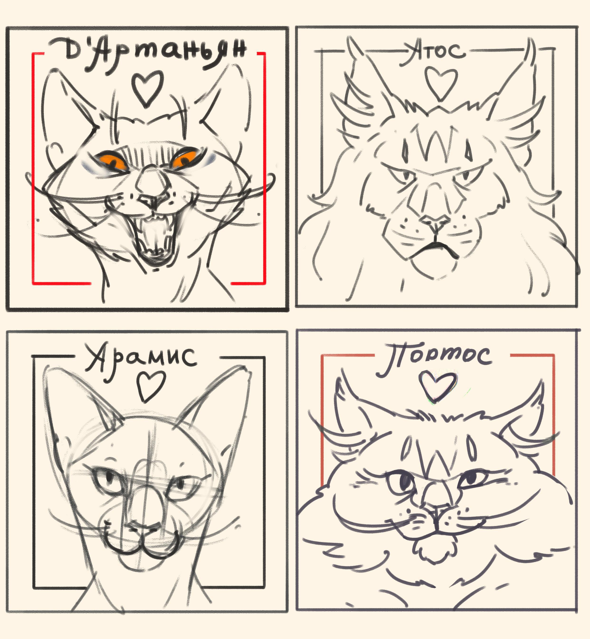 Первым делом около года назад набросала идею - котов-мушкетеров. Без шляп, шпаг, чисто стилизованые утрированные характеры. Даже цвет примерный раскидала, как мне тогда представлялось: