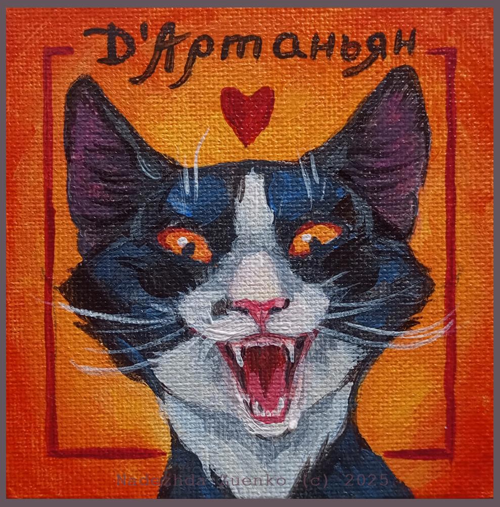 А вот когда начала с д'Артаньяном заниматься, подруга подала идею не делать его просто черным, а нарисовать "маркиза" а-ля реклама корма Феликс. И фото своего курва-бобтейла с разинутой на ёлку пастью присовокупила. Ну одно лицо, только нос белый :). Так главгерой стал помойным бобтейлом )).