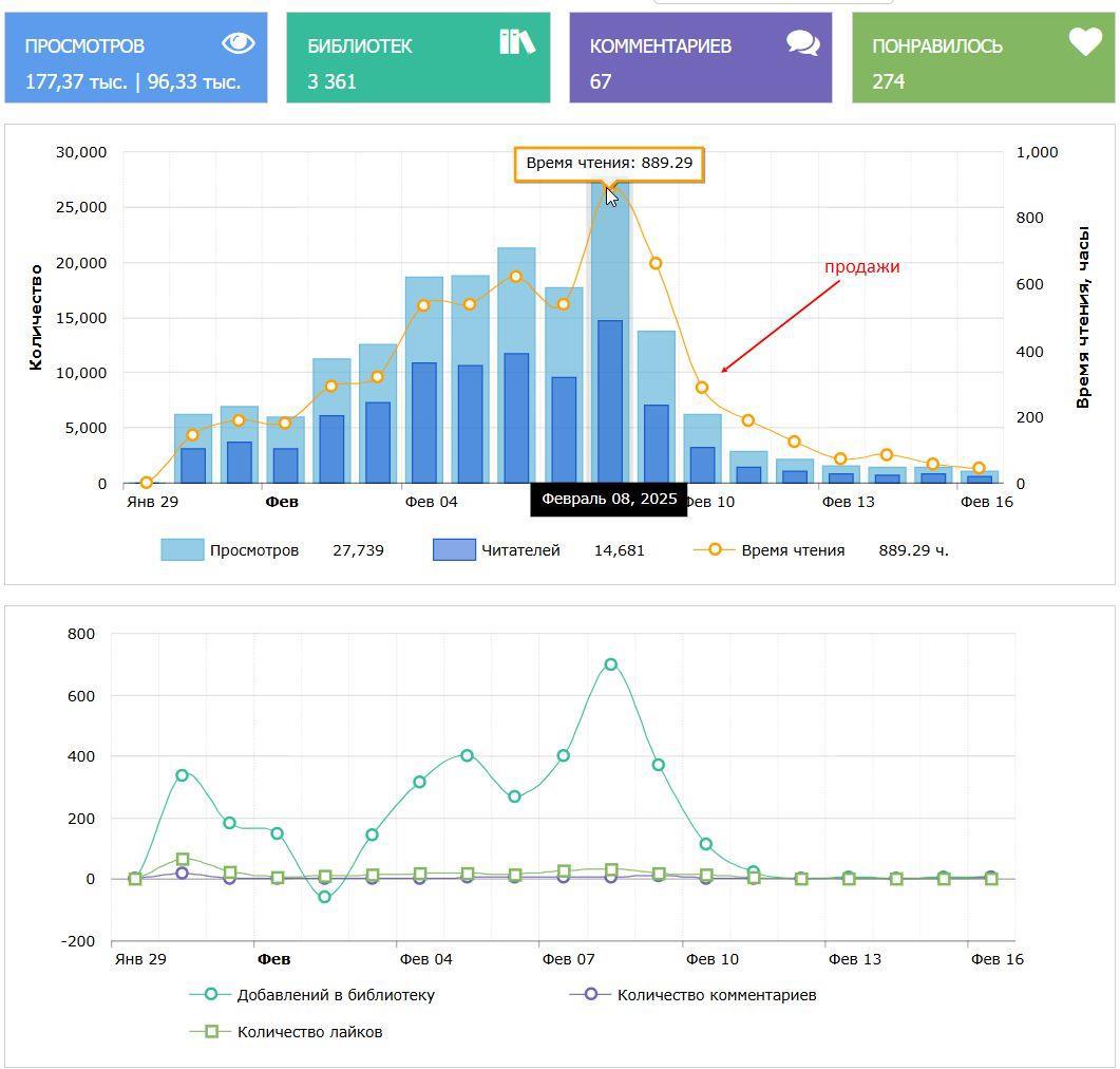 Вывод №4: хорошая идея на десятый день, когда реклама уже отлажена и нужен финальный рывок перед открытием продаж, выложить сразу две главы и потратить в этот день на маркетинг больше денег. Тогда по часам чтения скорее всего будет рывок вверх, что и видно на графике за 08.02.2025.