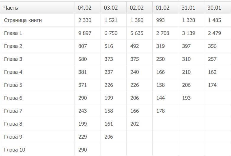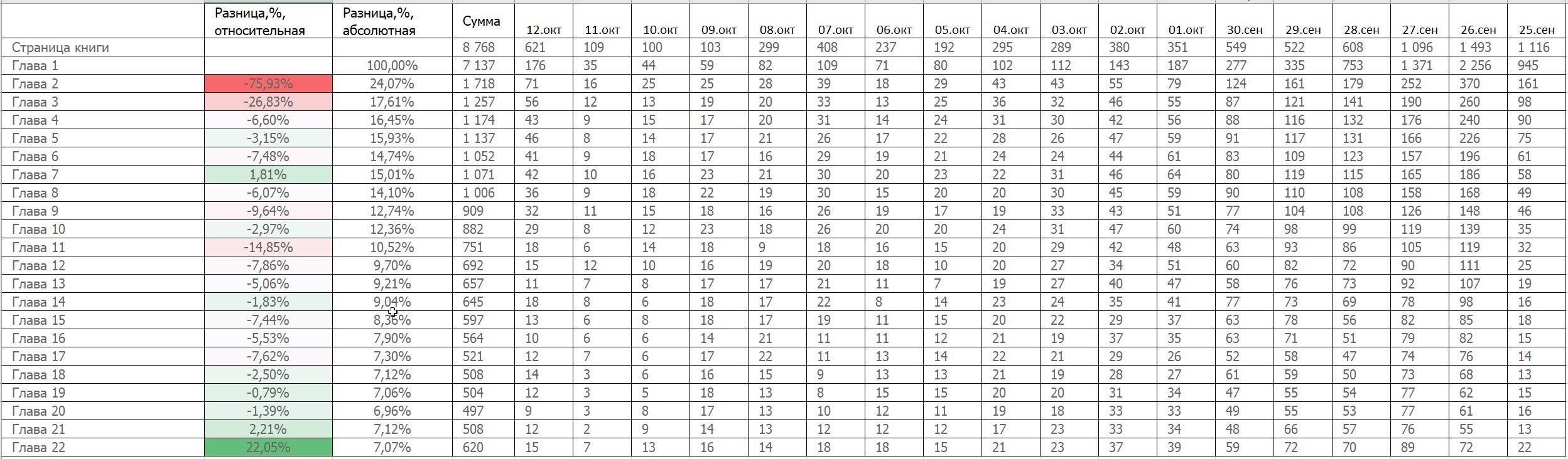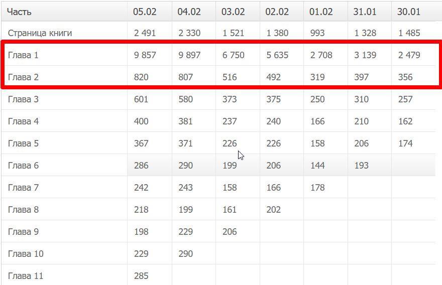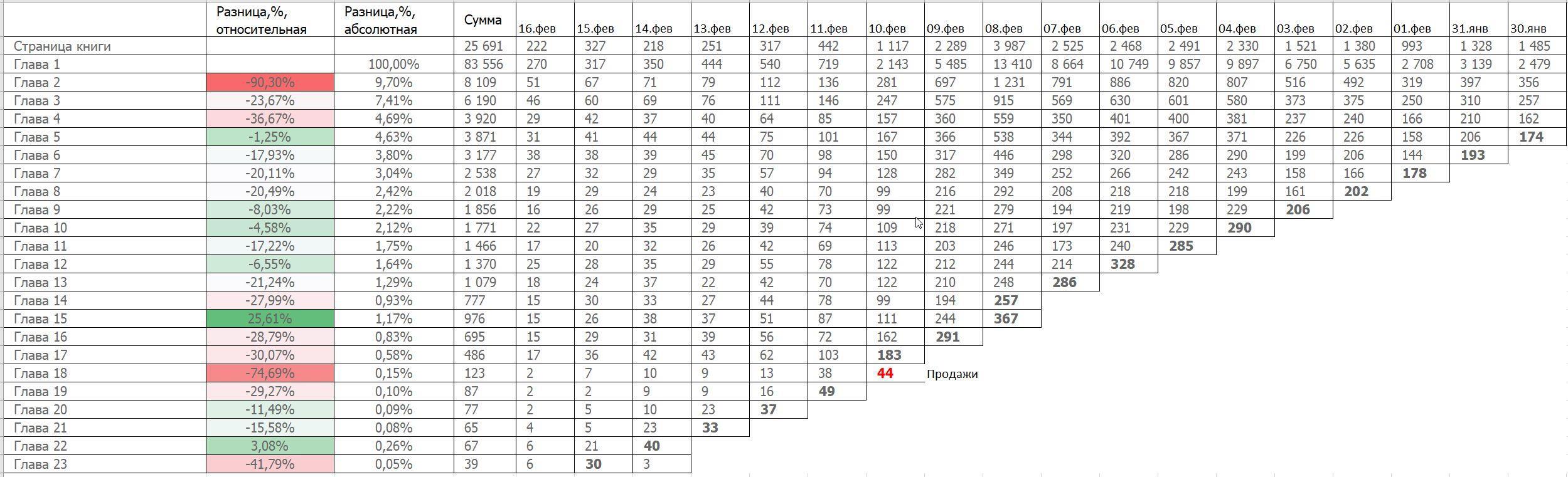 2) Это подтверждают не только продажи, но и соотношения лайков к библиотекам, общее число комментариев под книгой, низкий процент перехода на 2-ю главу, и, пожалуй, даже главное – низкое число людей на проде (при хорошем раскладе оно должно всё время расти и значительно превышать просмотры на предыдущих главах).