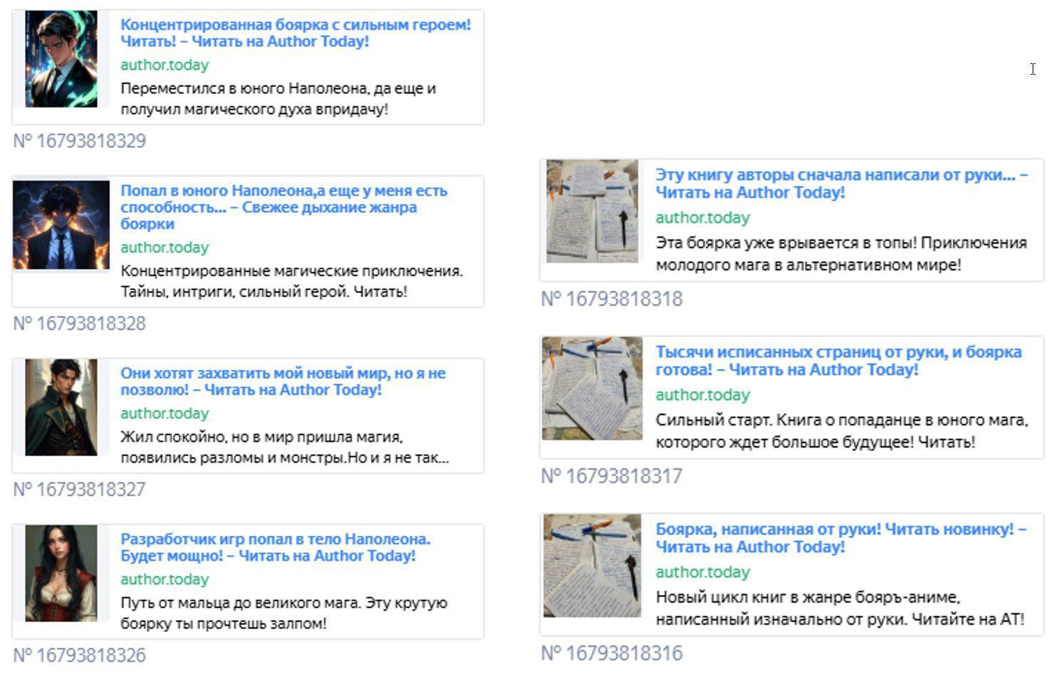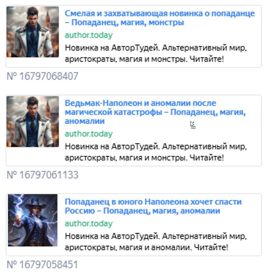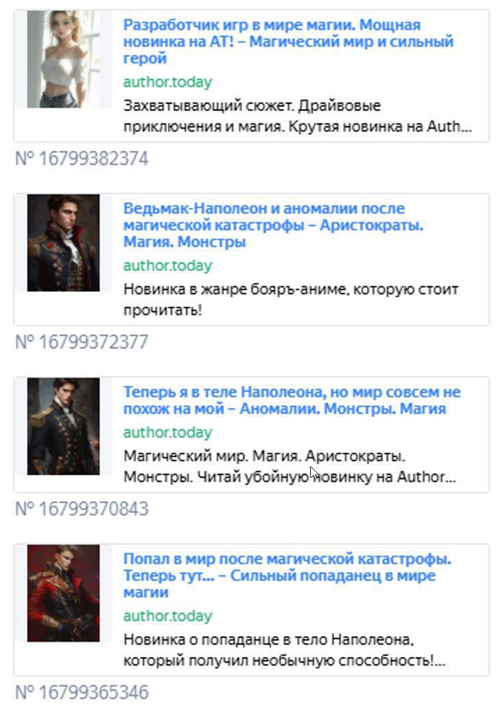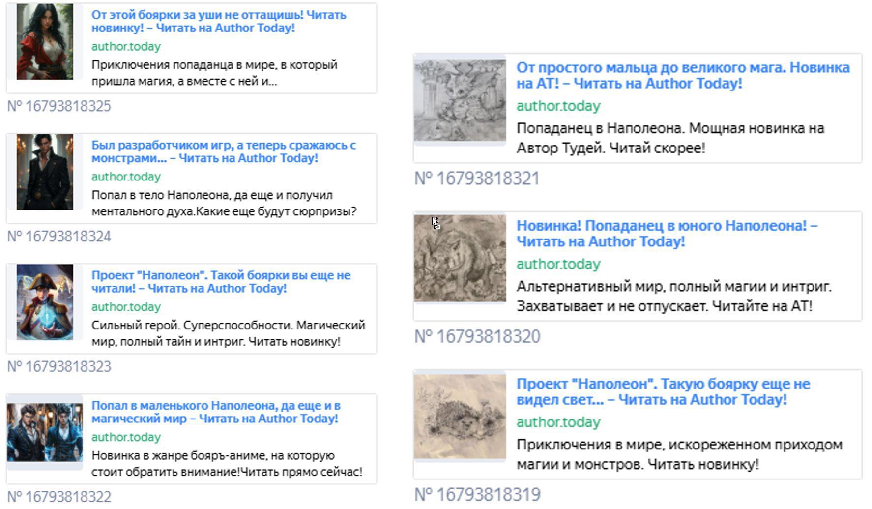 4) У меня книга про фантастического Наполеона. Поставил эксперимент по публикации в самых крупных сообществах про реального исторического Наполеона Бонапарта в ВК и в телеге. Стоило это одну тысячу рублей. И не дало какого-то видимого эффекта.