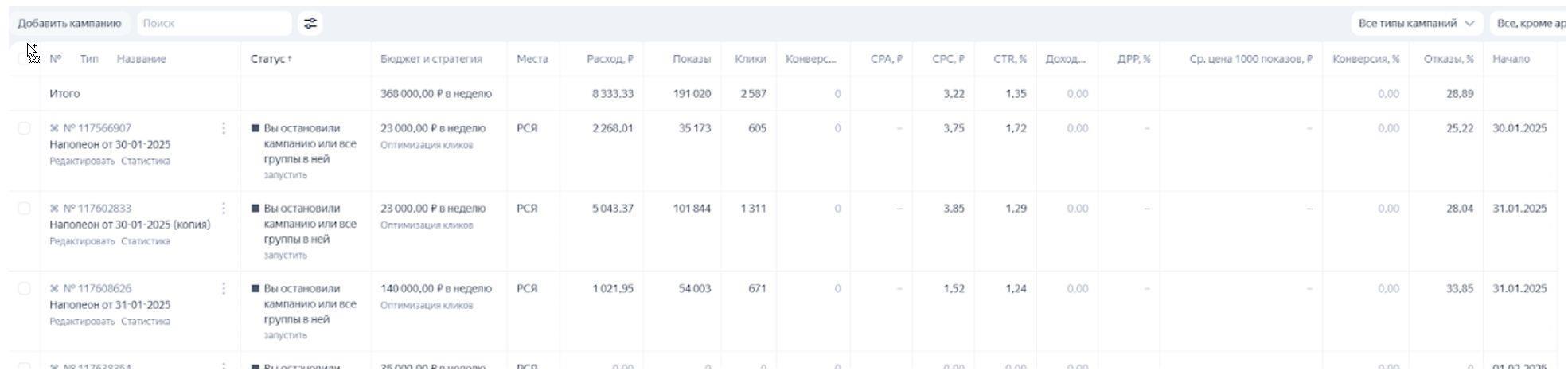 У стартовой кампании в ЯД выросло число отказов (25%) и цена клика (3,75 руб). Также она замедлилась, не вытягивая заданный лимит. Параллельно придумываем несколько новых креативов и подбираем арты: