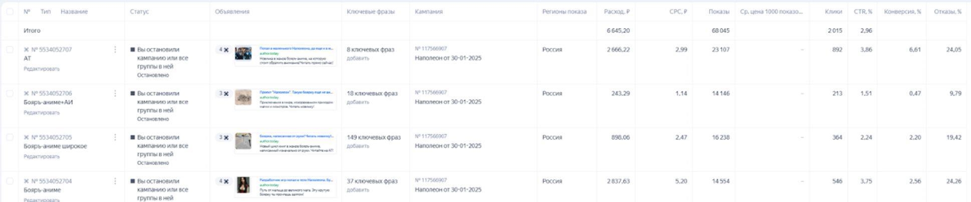 Решаем в будущем оставить ВК по минимуму, поскольку первые три дня показали, что отрывки из книги не заходят в рекламе (по крайней мере – на таком периоде). Часы чтения нужно набирать быстрее, а длительное и аккуратное тестирование ВК больше подходит для стабильной рекламы вдолгую. Так что часть бюджета из ВК переносим в ЯД.
