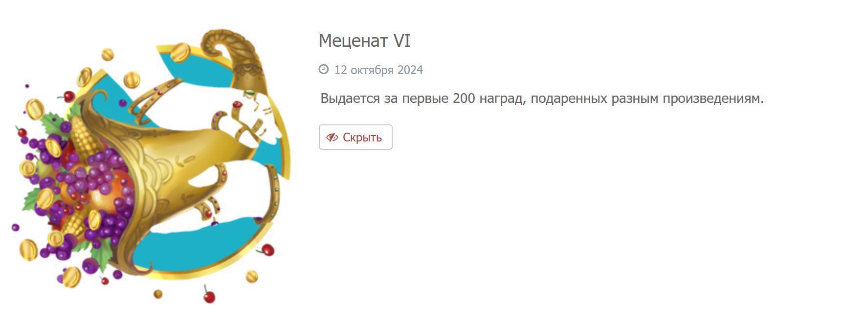 Что же остается начинающему автору? Расскажу свой путь. Начну с предпосылки: я сам не только начинающий писатель, но еще и очень активный читатель. Более того, я всегда покупаю понравившиеся книги, никогда не читая пиратки и всегда оставляю награду полюбившимся авторам. Даже вот достижение есть – Меценат VI уровня: