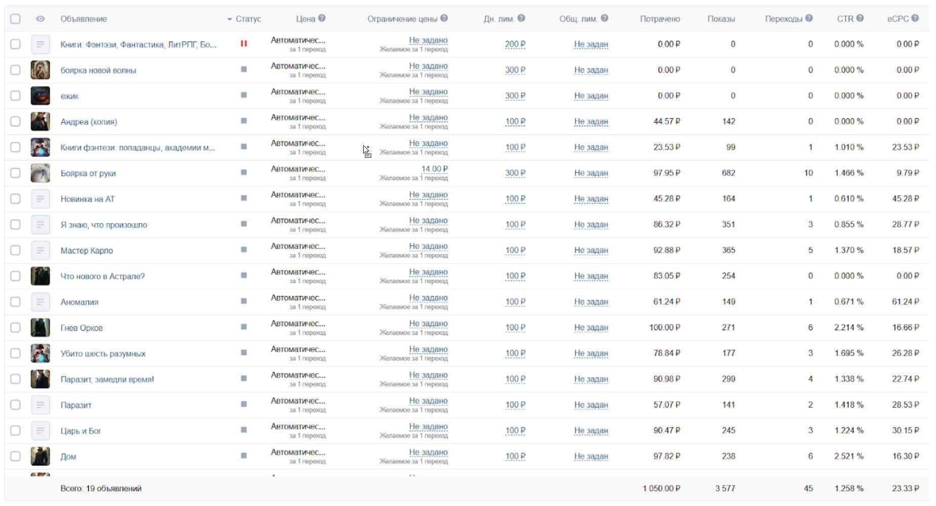 В ВК продолжается тестирование объявлений. Цена клика снизилась, но незначительно. Лучше всего показывает себя креатив «Боярка, написанная от руки». Гипотеза, о которой писал в разделе подготовки к запуску, таки сработала. Но в любом случае бюджеты низкие и это накладывает отпечаток, а также не влияет стратегически на результаты продвижения книги.