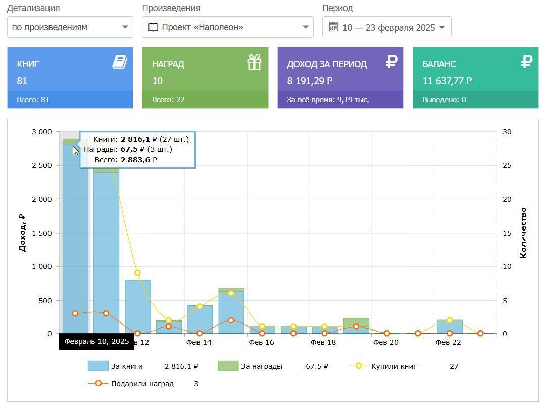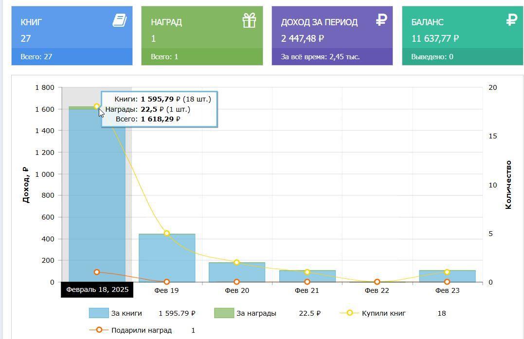Средняя цена библиотеки на книге получается 23 рубля. Это хороший показатель, но учитывая, что еще были бусты и другие способы продвижения, а также небольшая база аудитории, то реальная стоимость библиотеки сильно выше.