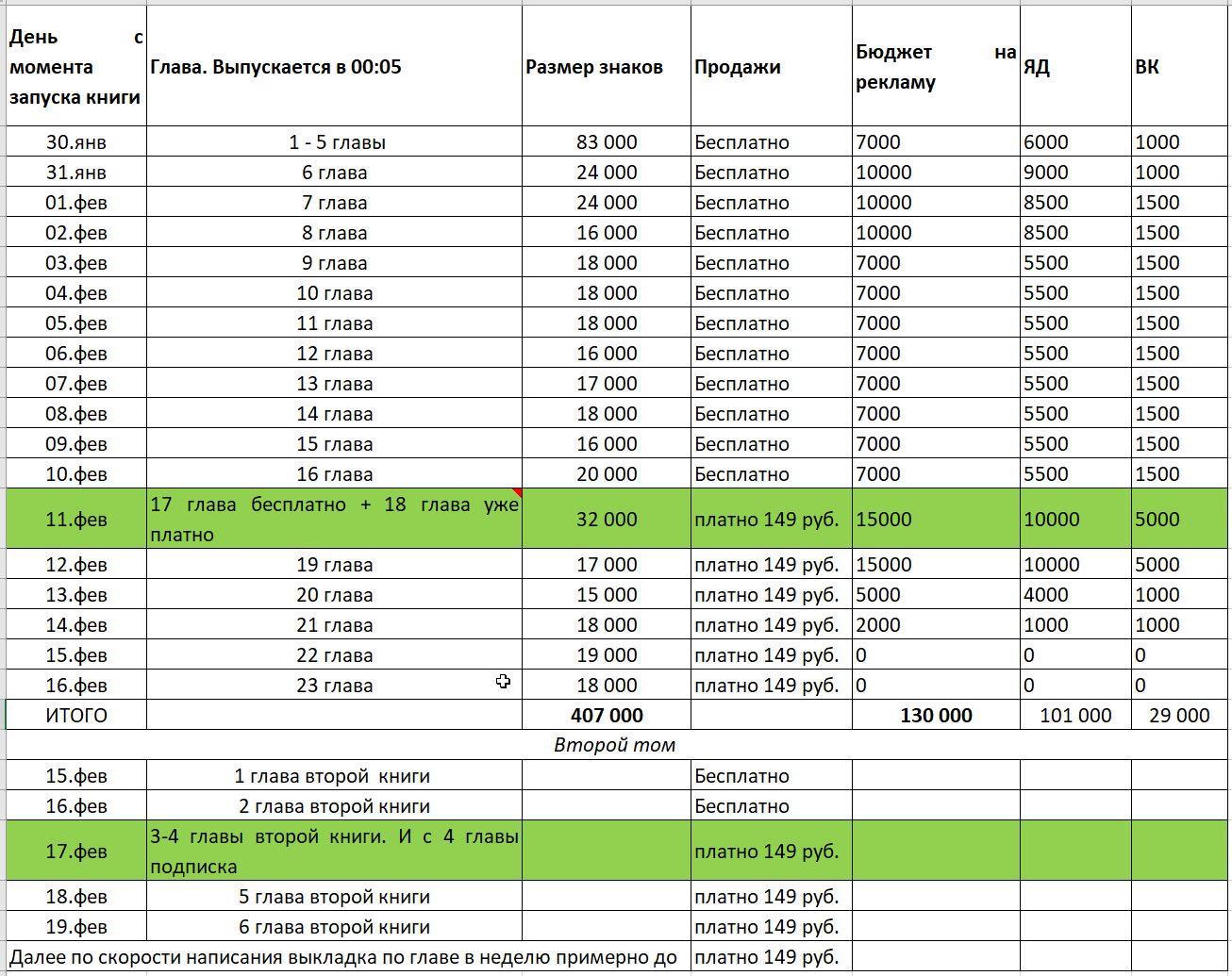 В некоторых моментах основываясь на анализе данных план адаптировался под ситуацию. например, в один из дней выложили сразу две главы, вместо одной, а расходы в ВК в определенный момент снизили, перераспределив бюджеты в Яндекс.Директ. Подробнее об этом распишу далее.