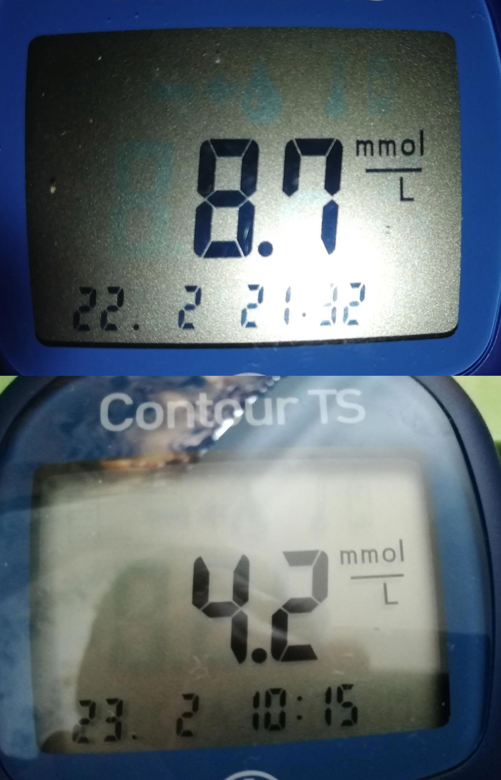 Первый - это через два часа после еды. Второй - это наутро, натощак. После еды (независимо от того, что я съел - картошку ли, гречку ли с кетчупом или макароны) у меня примерно такая кривая: через час - 8.1, через два часа - 8.7, через три часа - 8.2, через четыре часа - 7.5. (Все пальцы исколол уже ради карманного Дракулы). Надо сказать, это все нечестно - я же не ем сладкого (ну, могу вафлю позволить или пару полосок шоколада), хожу каждый день по 5000 шагов, сбросил вес. То есть, уже не норма. (Норма - это когда ешь все подряд, литрами пьешь сладкую воду, весишь 120 кг, а сахар с утра не выше 5.5, через два часа после еды - до 6.5). У меня же вот такой расклад. Может, кто из медиков подскажет, что еще сделать для дальнейшего снижения сахара после еды? (Натощак вроде он более-менее, хотя, насколько я понимаю, надо стремиться к нижней границе в 3.6 - глюкометр откалиброван по плазме). Может, устроить полную голодовку хотя бы на пару-тройку месяцев? (Доктор Хайдер голодал 218 дней - 7 с лишним месяцев, говорят, и никаких последствий). Тогда поджелудочная, может, отдохнет и восстановится. Или не стоит?