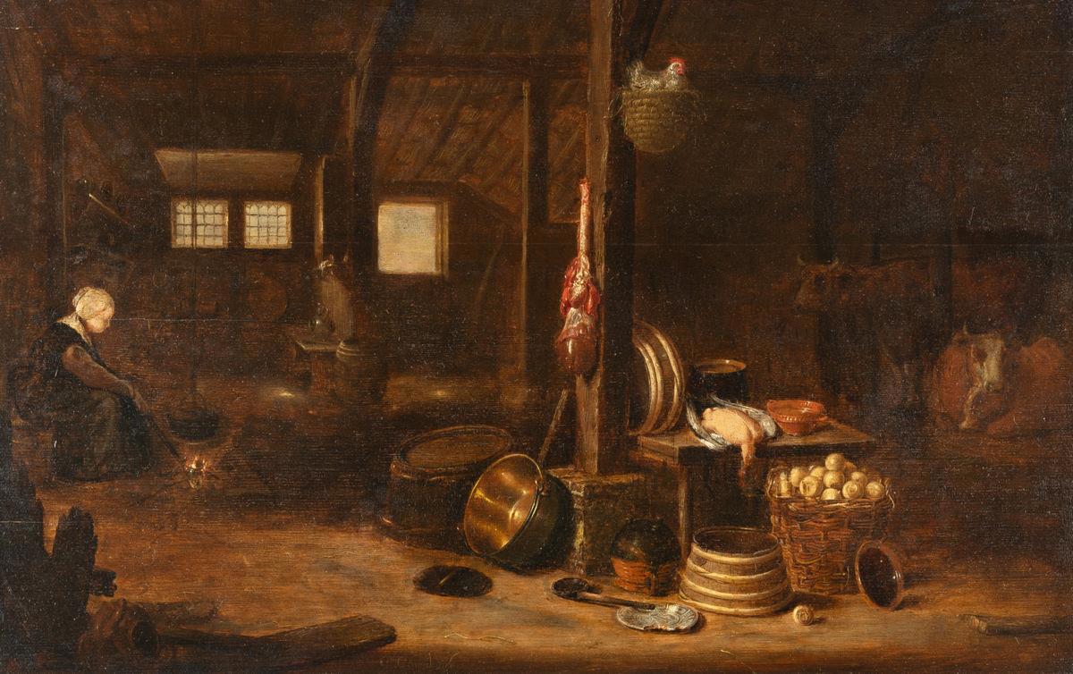 На картине женщина готовит еду на таком же костре, хотя дом довольно богатый, судя по двум коровам, попавшим в кадр и по здоровенному медному котлу в центре. За богатство говорит и обилие мяса и овощей.