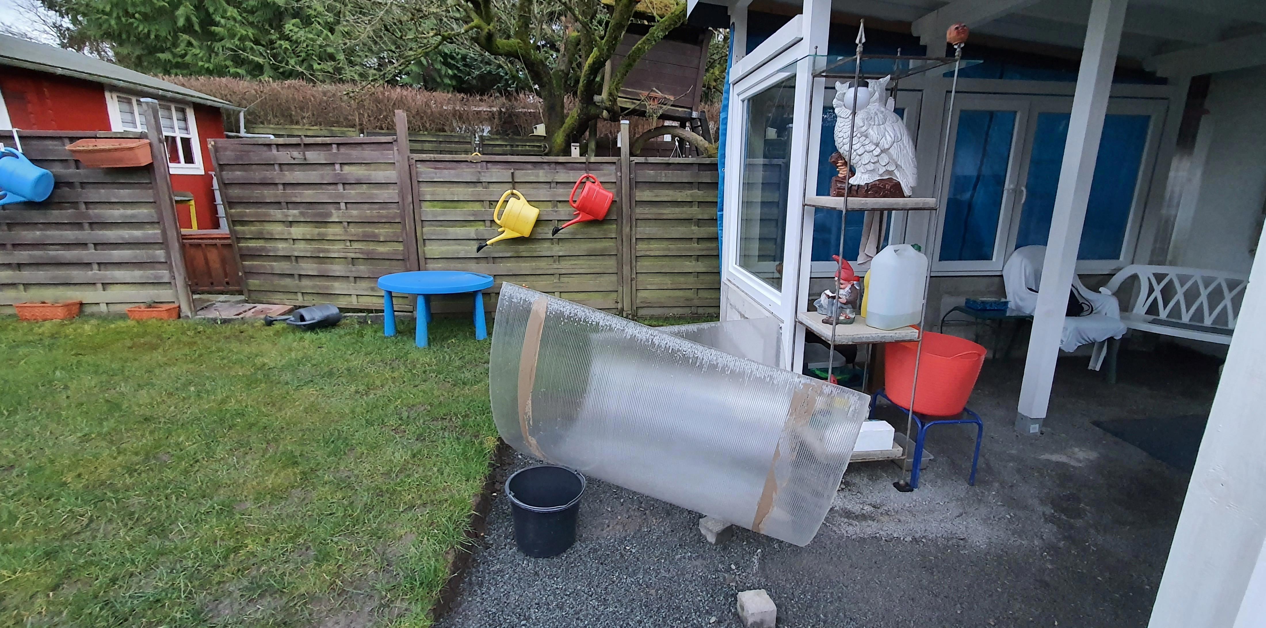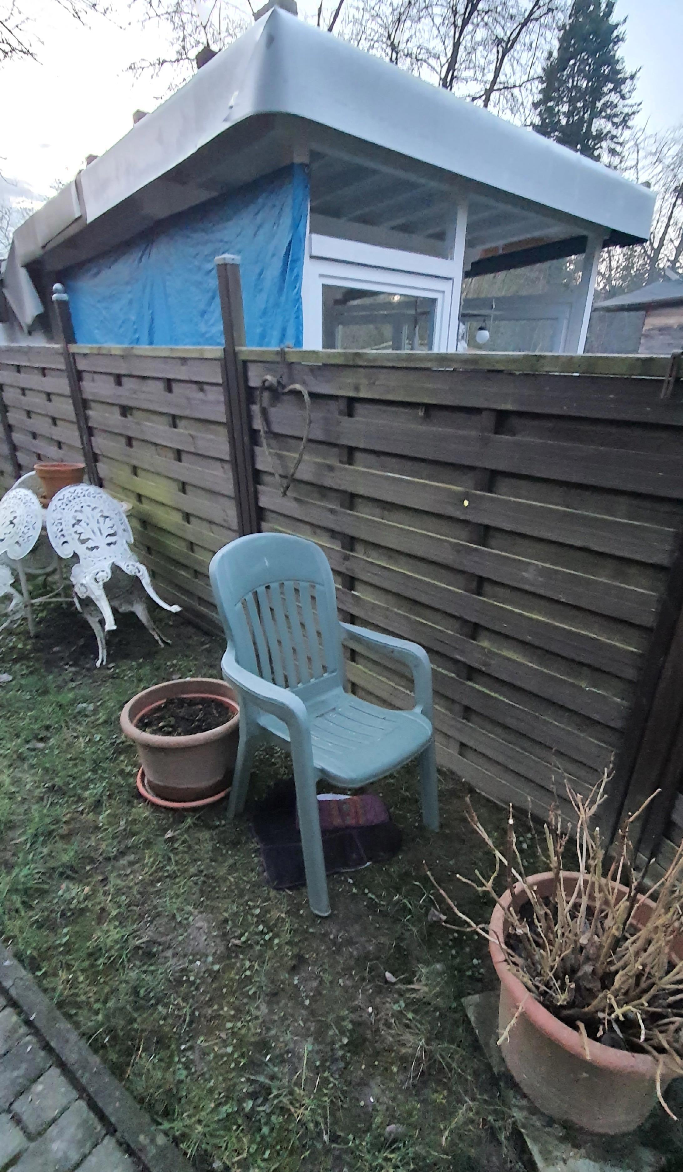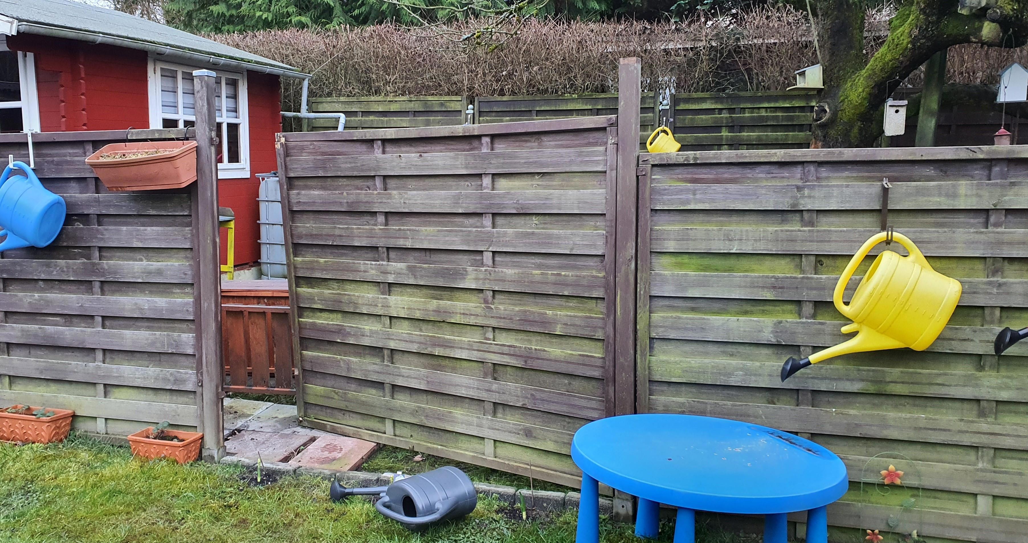 Сначала не увидела, что у соседей забор с моей стороны сломан. Думала пластик ветром снесло, но, стол у забора сам же не поставился, до этого он к прозрачному пластику был наклонён на террасе.